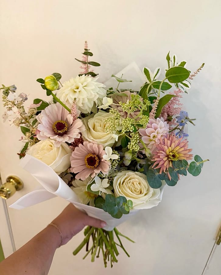 A beautifully balanced hand-tied bouquet featuring a curated mix of seasonal flowers, premium blooms, fresh greenery, and soft filler flowers. This arrangement offers a full, garden-inspired look with a thoughtful blend of texture and color.