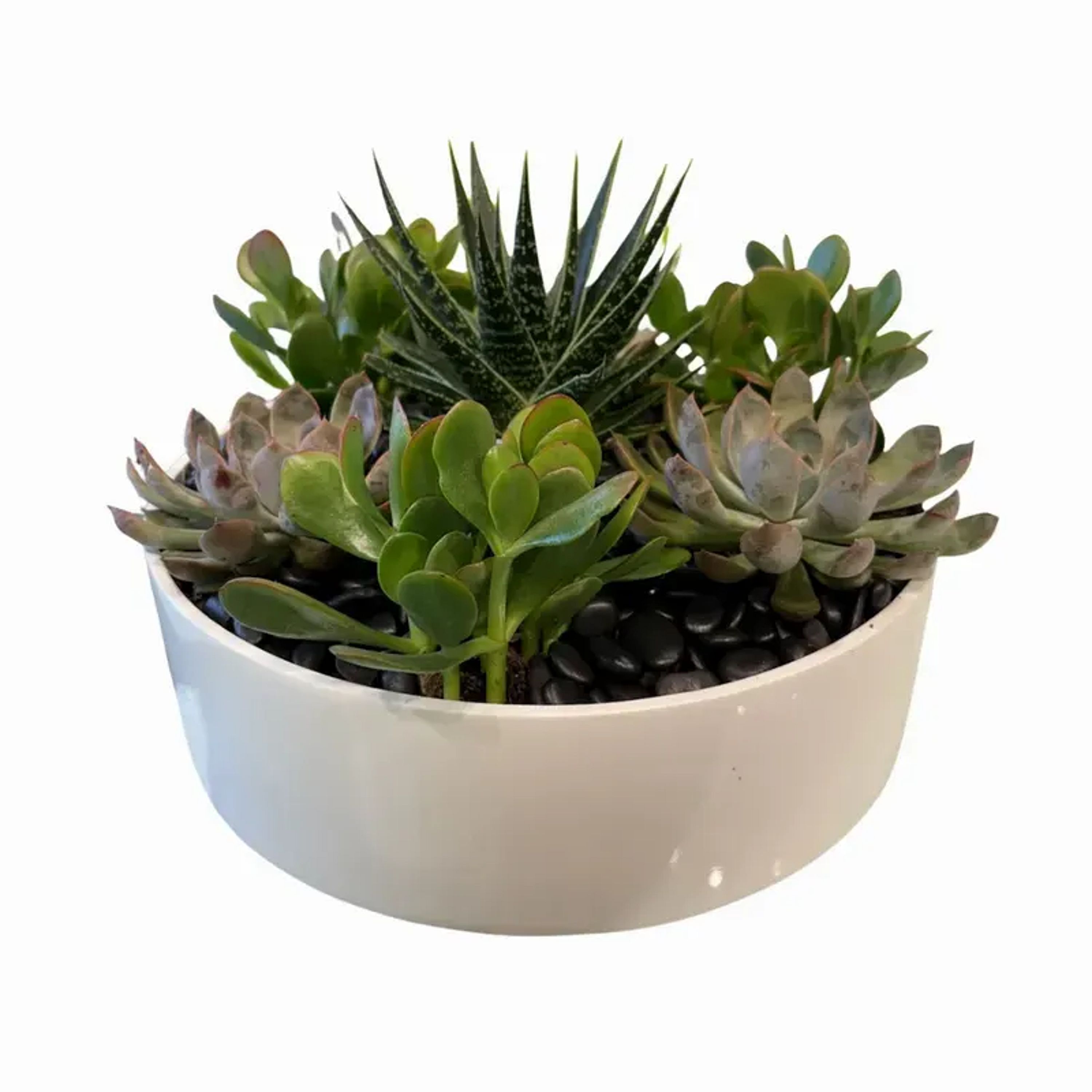 Mixture of premium succulents in a white ceramic container with natural rocks. Substitutions may be necessary due to availability. Product ID 42262