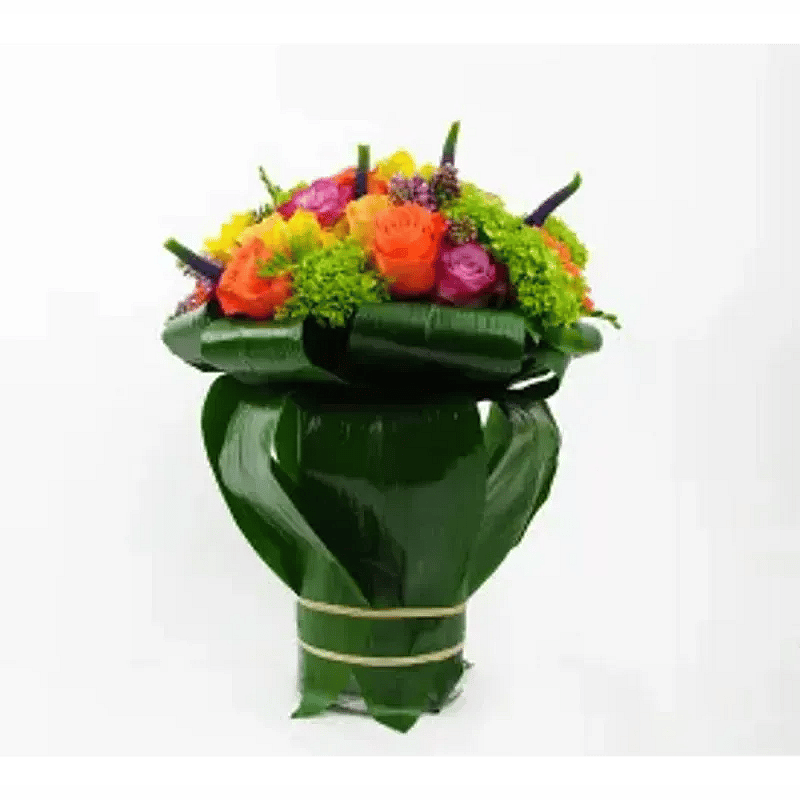 Long Leaves sculpturally wrapped around medium cylinder vase with festive brightly colored diverse flowers including pristine roses, petite hydrangea, and veronicas. Substitutions may be necessary due to availability. Product ID 89875