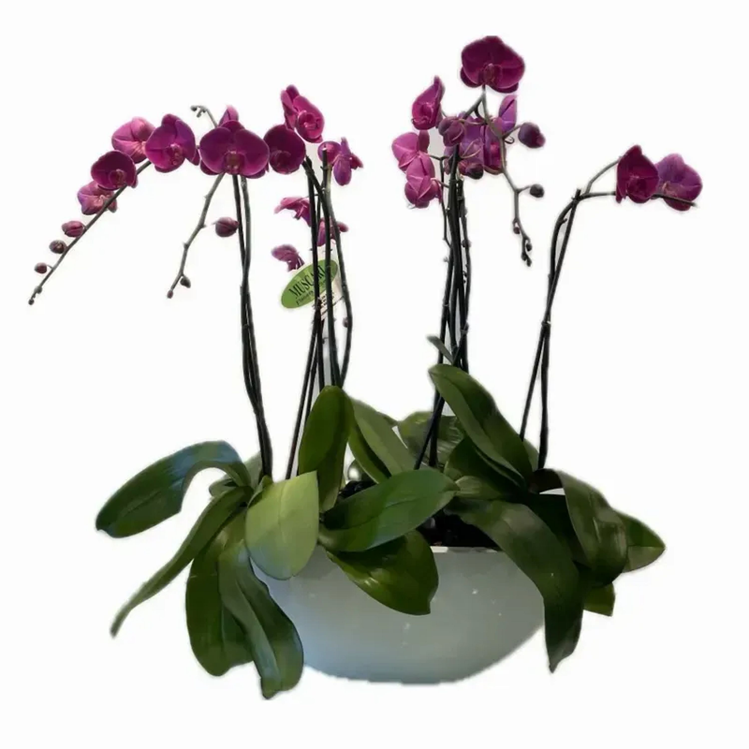 Our Purple Orchid Modern is a stunning display of vibrant color and delicate beauty. This impressive plant boasts 6 tall flower stalks. Product ID 1058