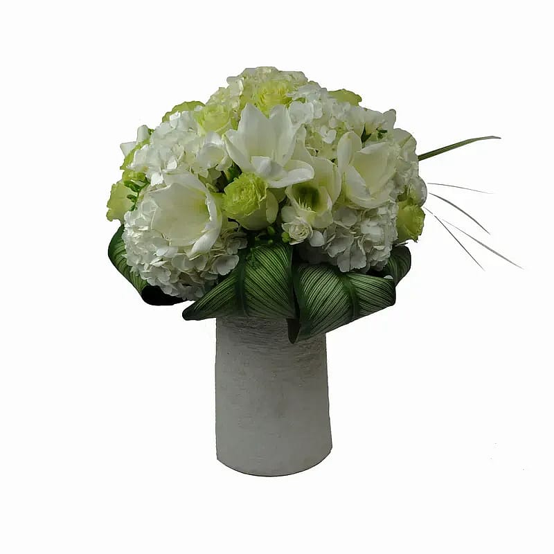 Elegant all white arrangement of mixed blooms with artistically folded tricolor leaves in rustic stone cylinder. Substitutions may be necessary due to availability. Product ID 98512