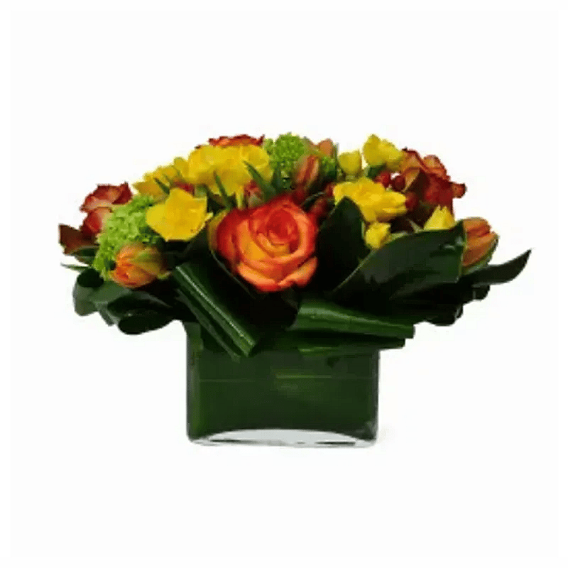 (25) Beautiful low rectangular centerpiece for fall or thanksgiving dinner table! All premium flowers and fall colors in a clear glass. Vase is 6" long. Substitutions may be necessary due to availability. Product ID 251265