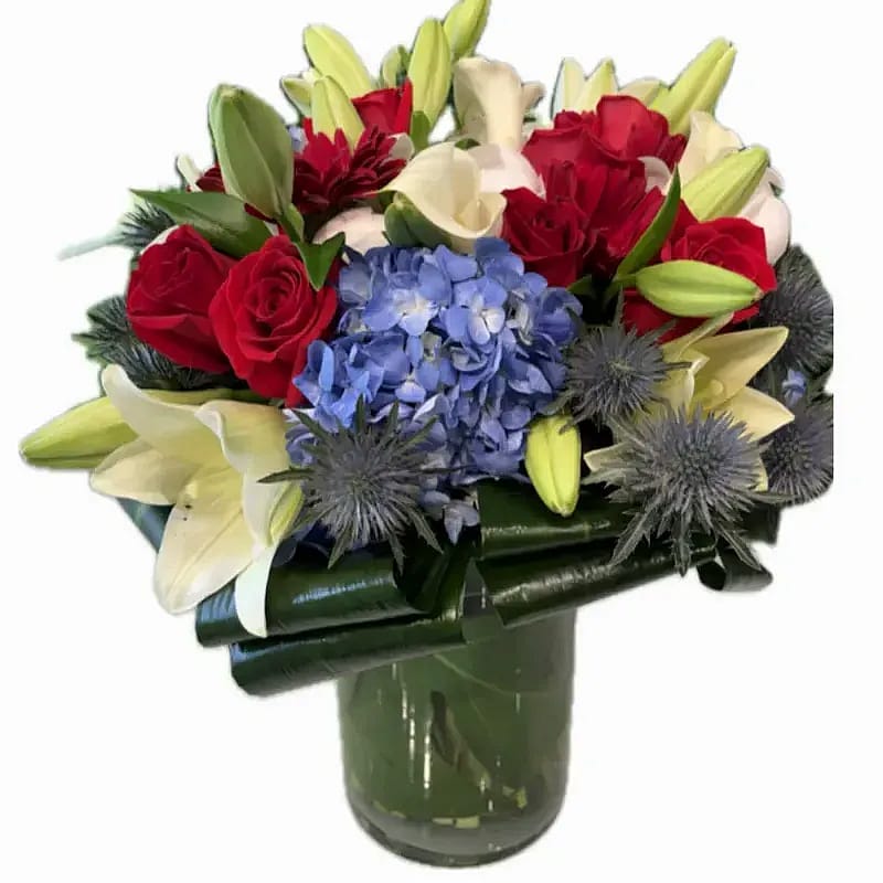 (83) This striking floral arrangement captures the spirit of patriotism with its vibrant display of red, white, and blue blooms. The arrangement is a harmonious blend of these iconic colors, perfect for expressing national pride, commemorating special occasions, or simply adding a bold and beautiful statement to any setting. Combining textures and flower shapes within the red, white, and blue palette ensures a visually dynamic and meaningful display.
