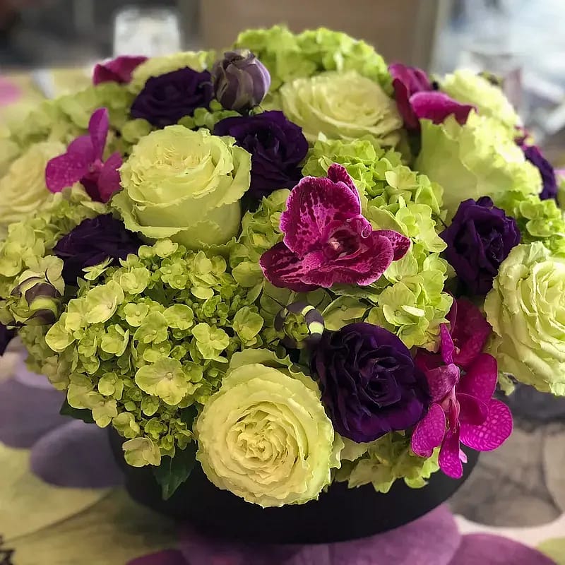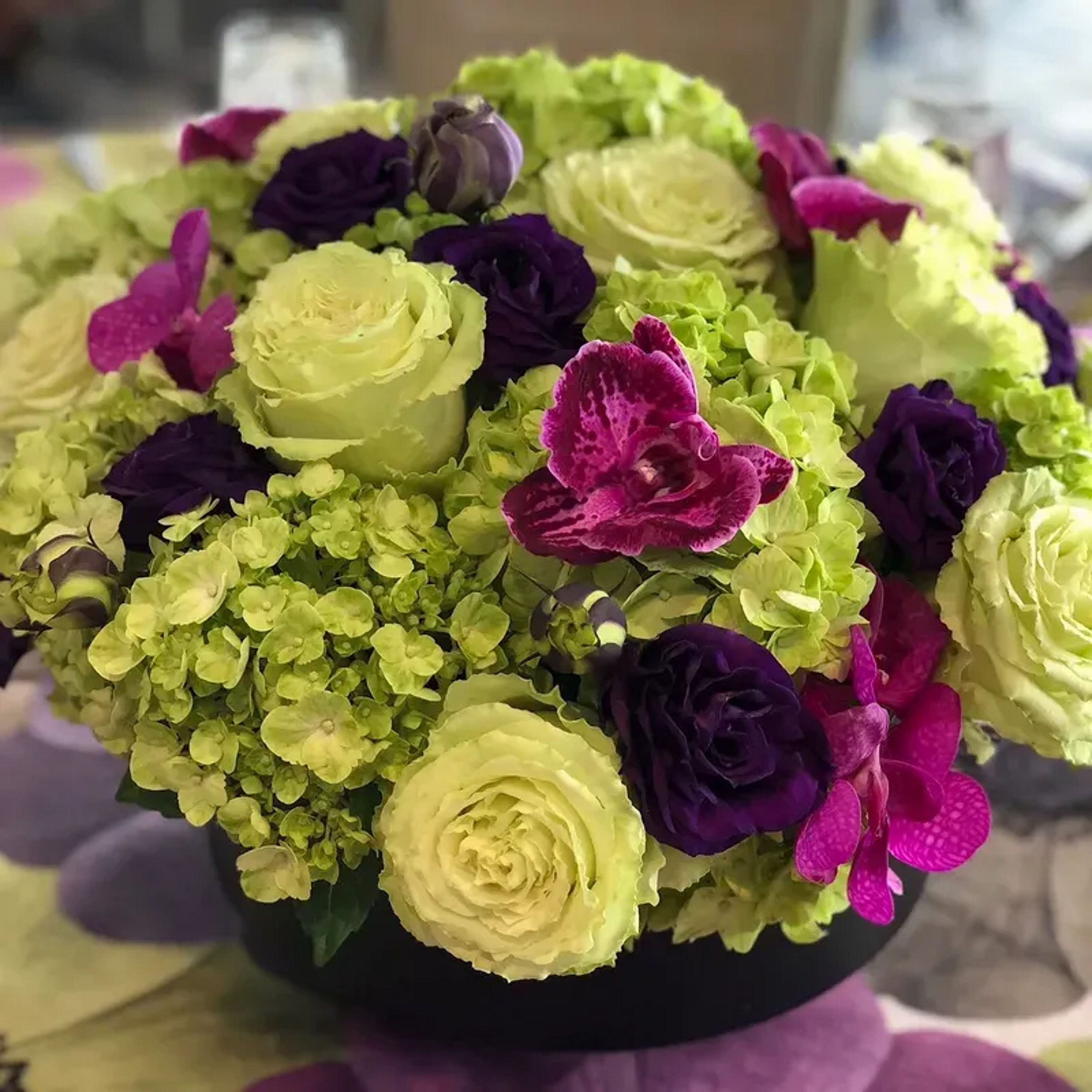 The "Enchanted Garden" arrangement is a mesmerizing display of nature's beauty, combining lush shades of purple and green blooms. Product ID 1247