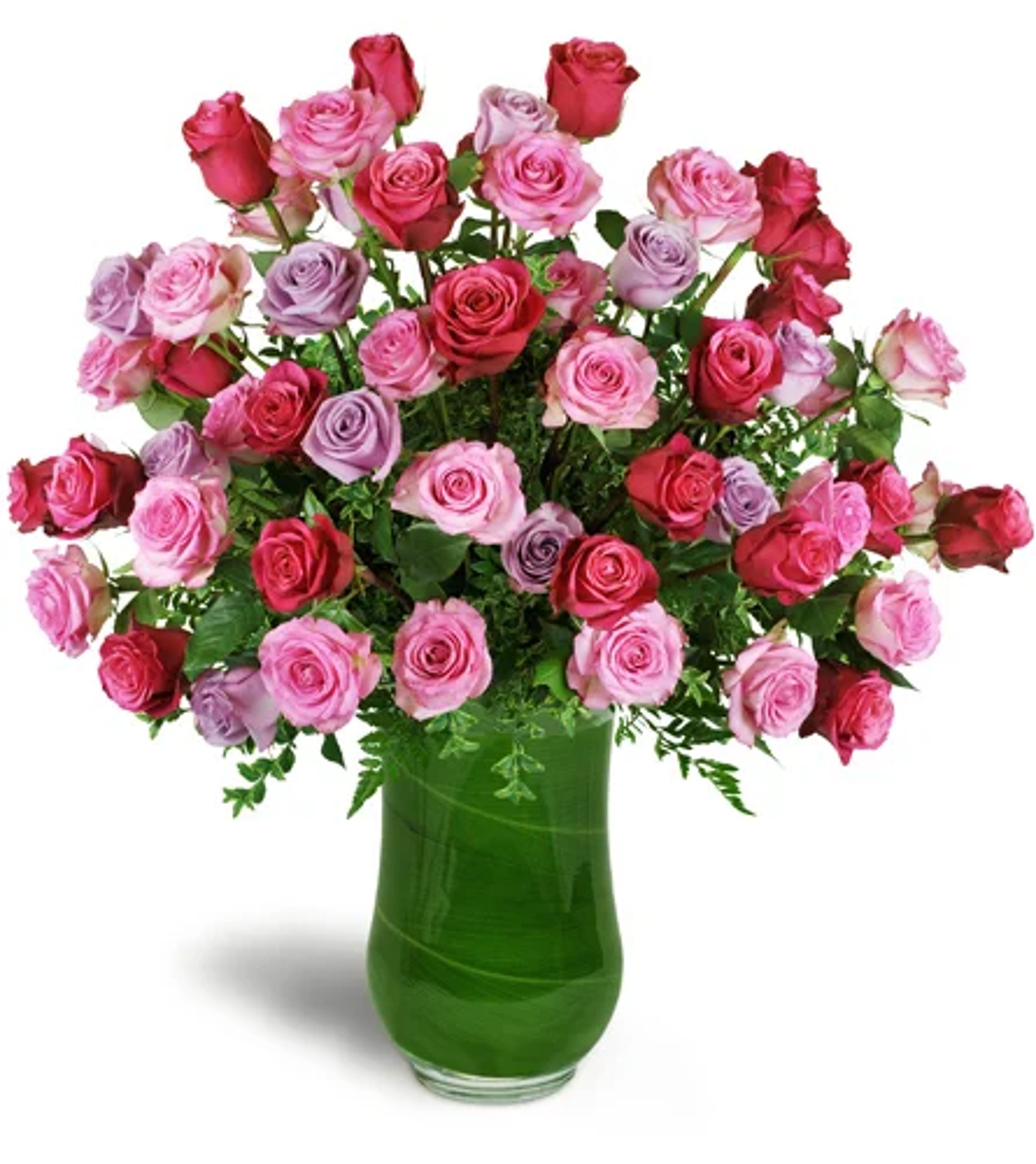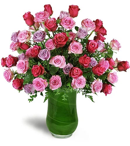 Five dozen premium roses in fuchsia, pink, and lavender are expertly arranged in a clear vase.