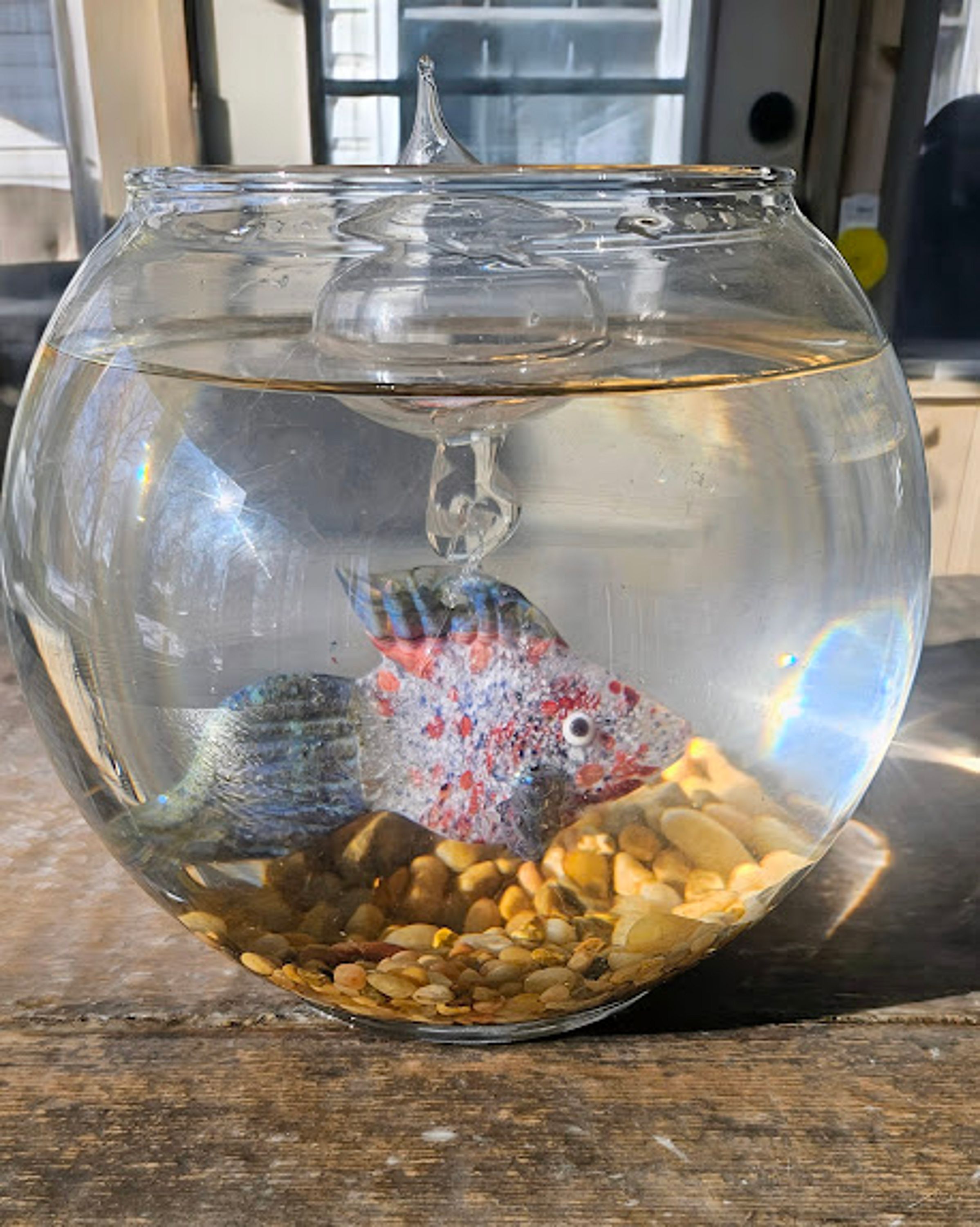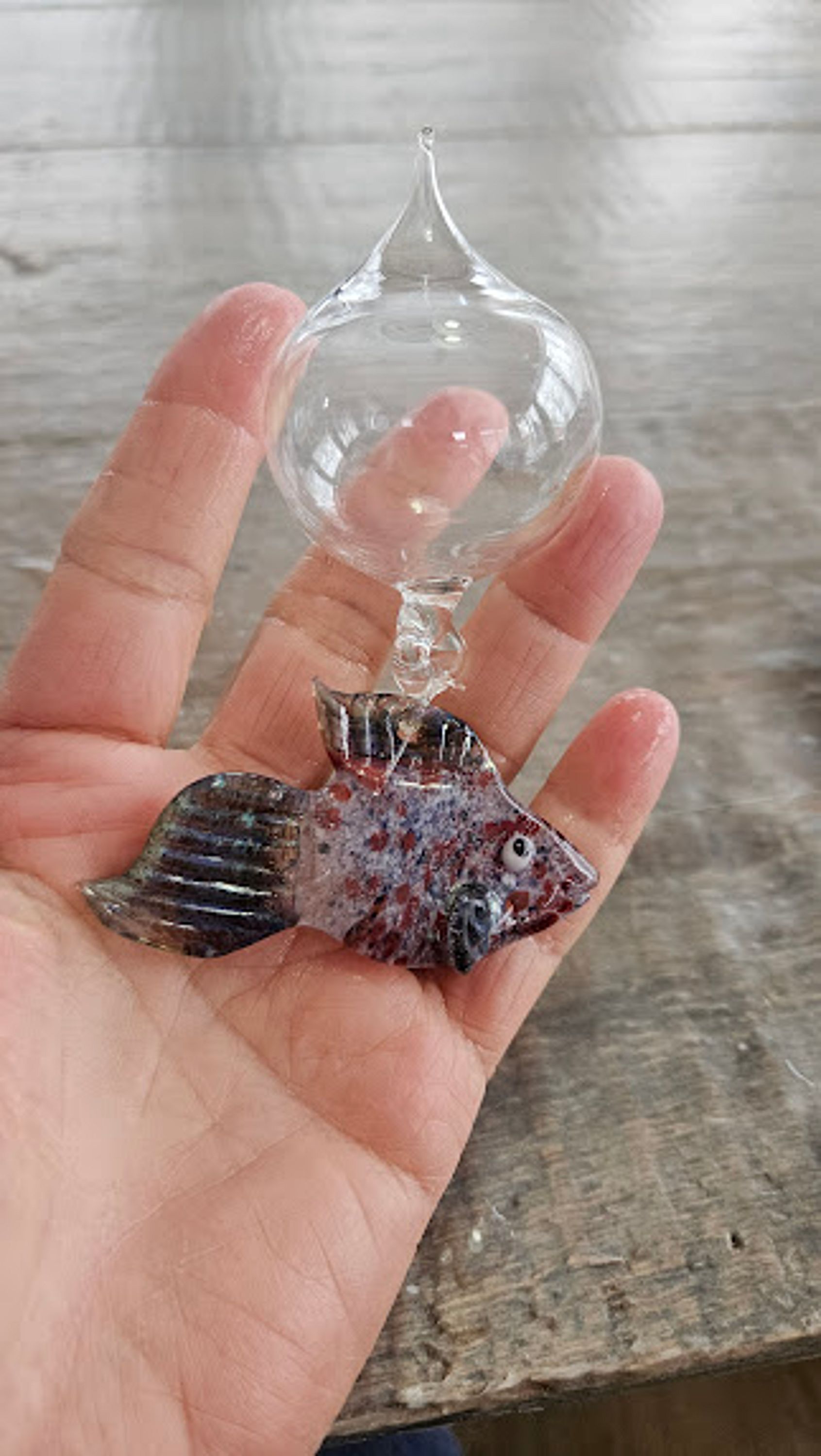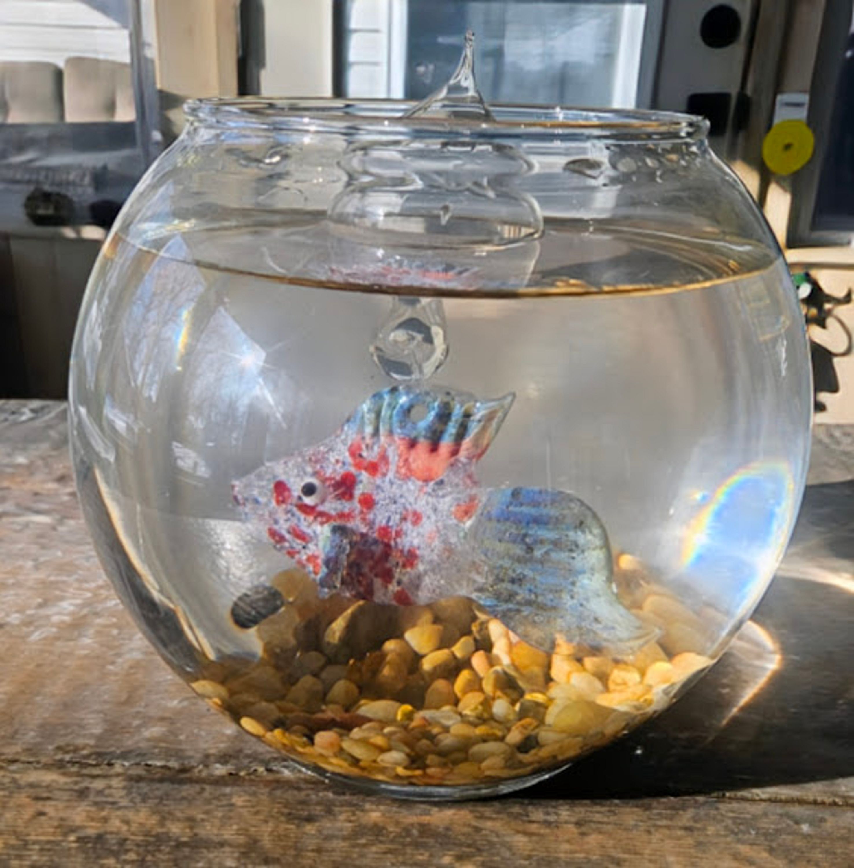 Individually hand sculpted borosilicate glass, red spotted multicolored fish, hangs from a hand-blown borosilicate glass ball. The fish measures 2 7/8 long by 1.5 inches tall by 1 inch wide. The ball that holds air for it to float is 2 inches in diameter. The fish comes with a locally sourced 5.5-inch glass bowl. The gravel is not included. The fish may be placed in an aquarium without harm to your fish or water environment.