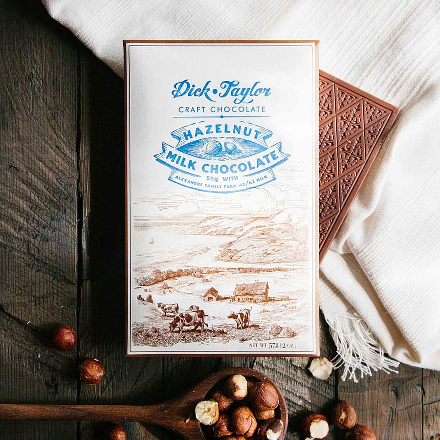 Delicately roasted Oregon hazelnuts have been paired with our exceptional milk chocolate made from earthy Ugandan cacao and old-fashioned A2/A2 whole milk from Alexandre Family Farm.