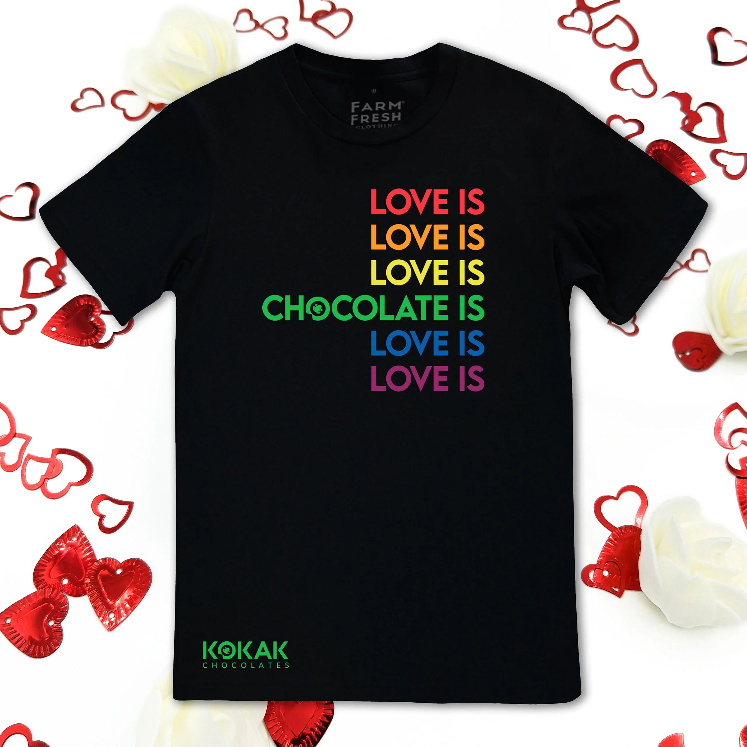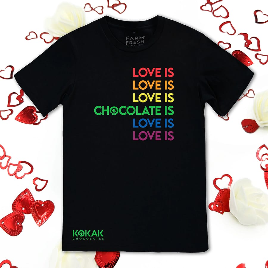 Celebrate your most fabulous self this Valentine's Day or any day of the year with this Kokak Chocolates Love is Chocolate Tee made of soft, 100% organic cotton for a super comfortable, perfect fitting top. Screen printed within 100 miles of our chocolate shop.
