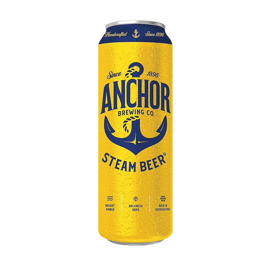 Anchor Steam Beer is widely available in a 19.2 oz. "stovepipe" can rather than a bottle, featuring the 4.9% ABV California Common-style brew with a rich, malty, and slightly hoppy flavor. The large cans are designed for convenience and to highlight the classic, deep amber-colored brew.