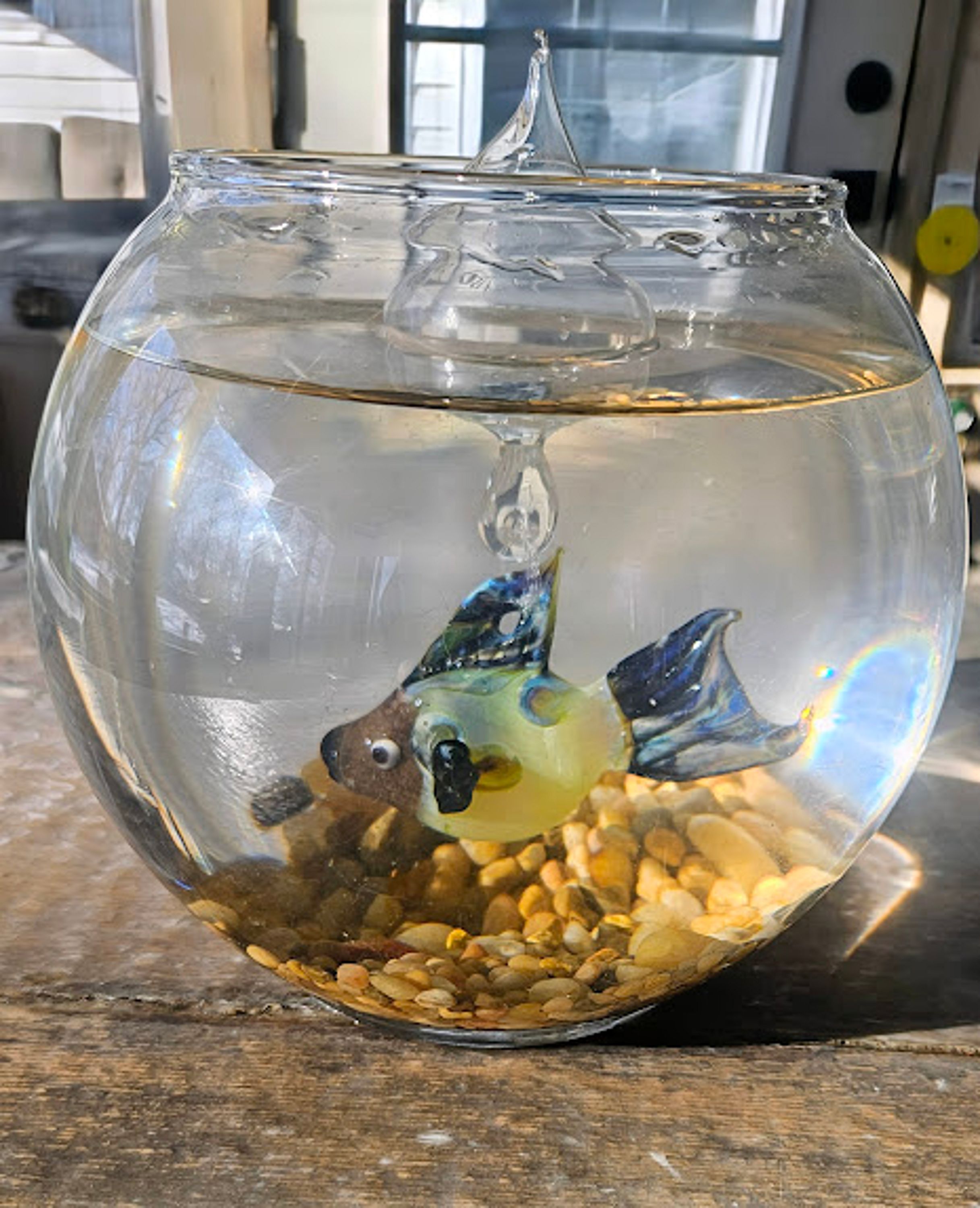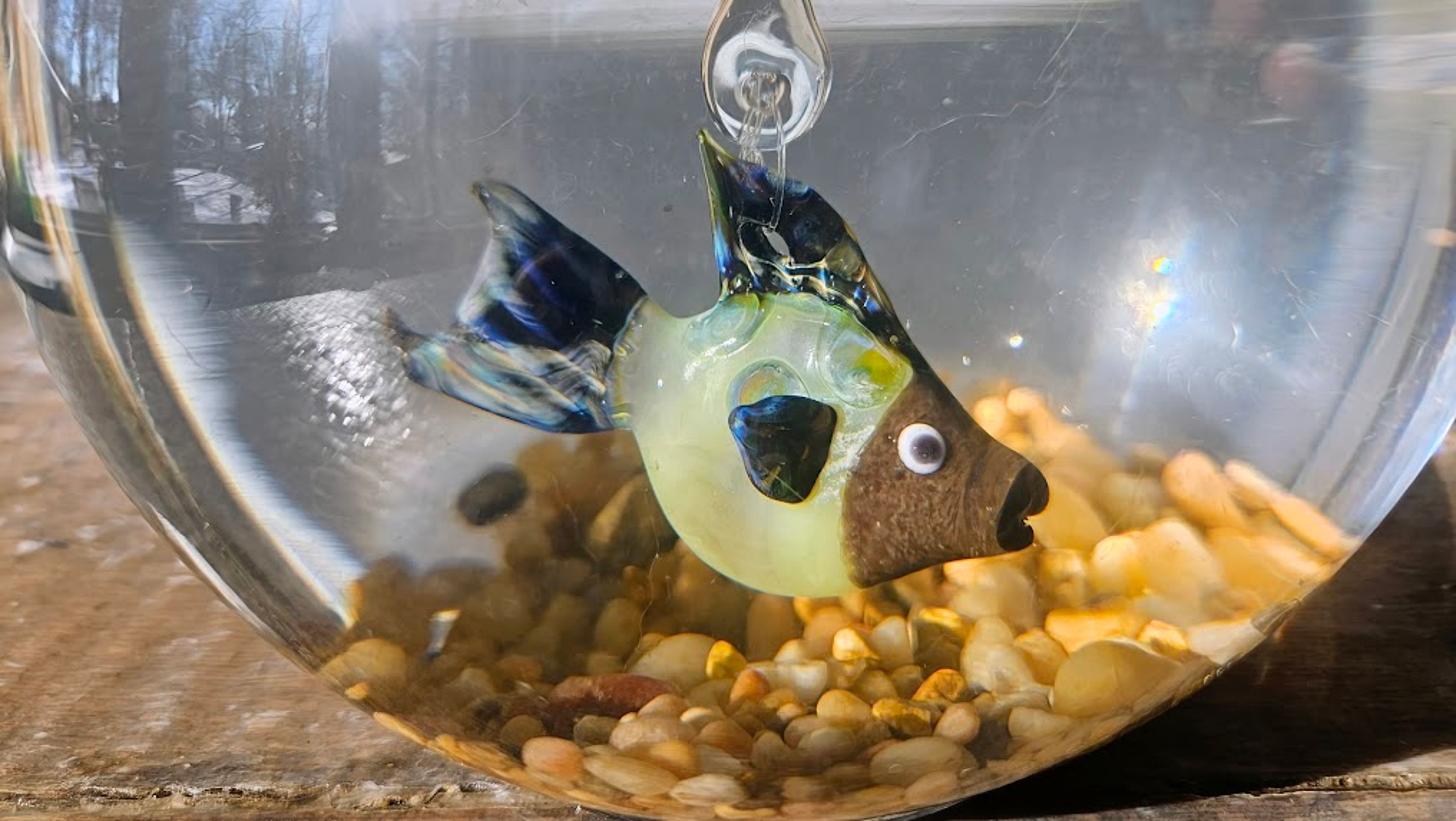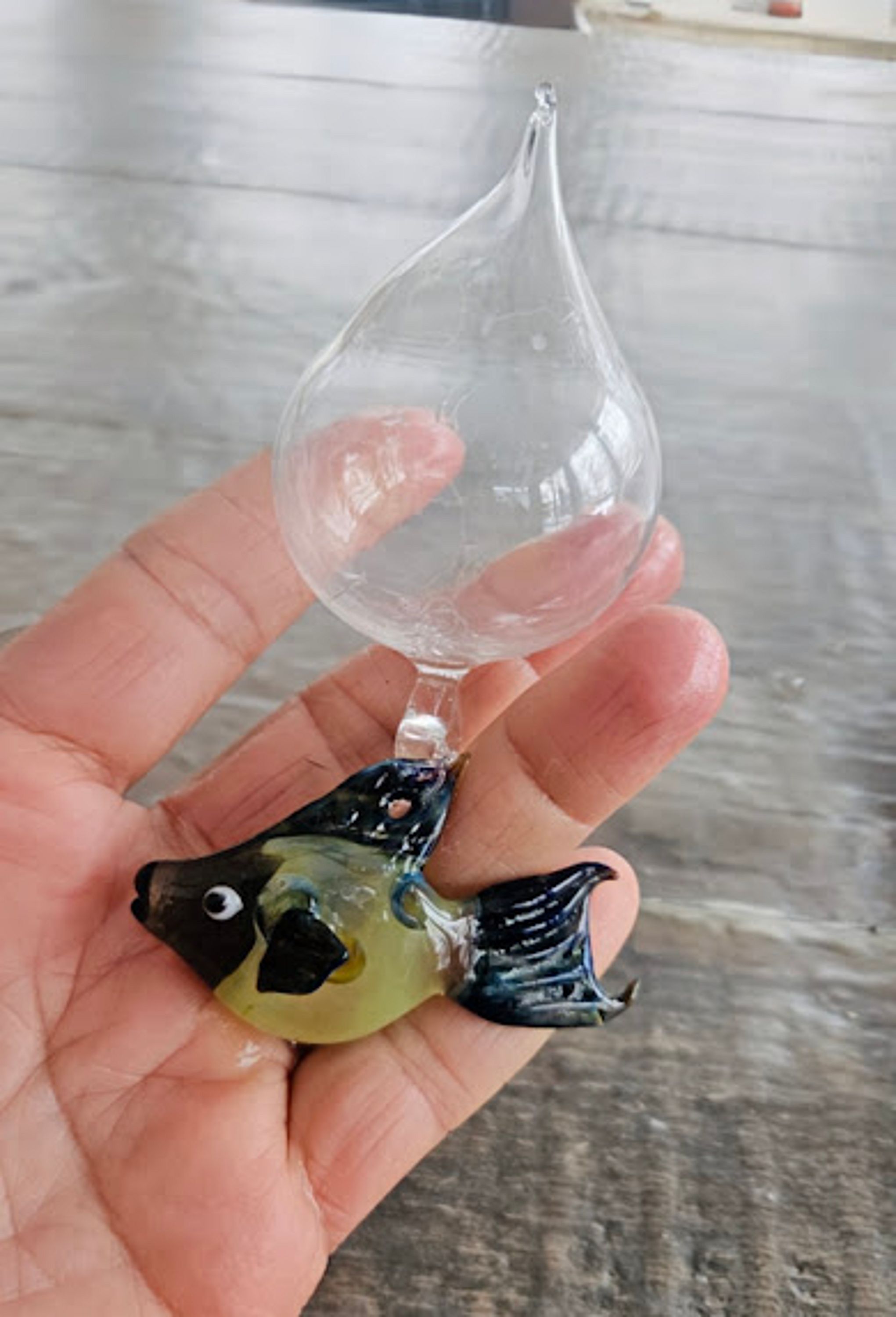 Individually hand sculpted borosilicate glass, brown, light green and multicolored fish, hangs from a hand-blown borosilicate glass ball. The fish measures 2 1/2 long by 1.5 inches tall by 1 inch wide. The ball that holds air for it to float is 1 7/8 inches in diameter. The fish comes with a locally sourced 5.5-inch glass bowl. The gravel is not included. The fish may be placed in an aquarium without harm to your fish or water environment.