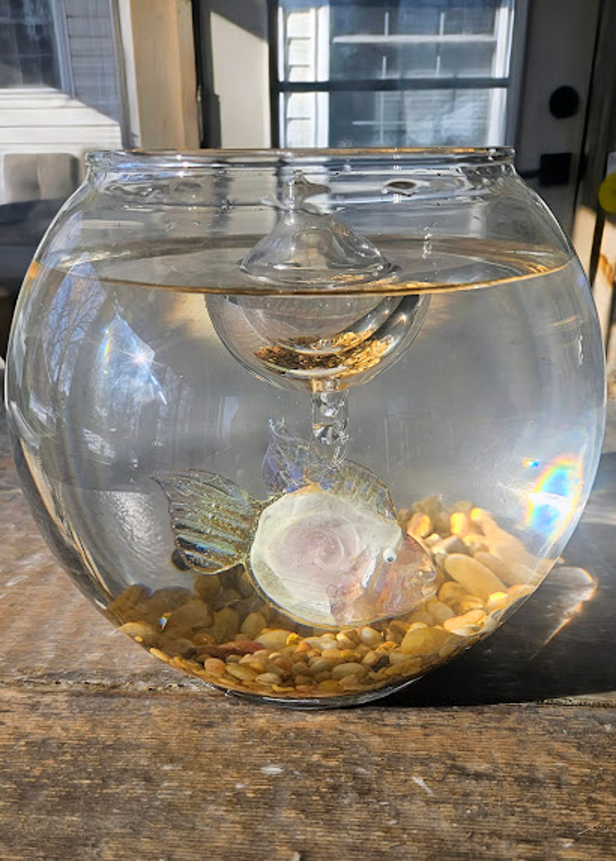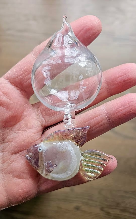 Individually hand sculpted borosilicate glass, purple and light green multicolored fish, hangs from a hand-blown ball. The fish measures 2 1/2 long by 1.5 inches tall by 1 inch wide. The ball that holds air for it to float is 1 7/8 inches around. The fish comes with a locally sourced 5.5-inch glass bowl. The gravel is not included. The fish may be placed in an aquarium without harm to your fish or water environment.