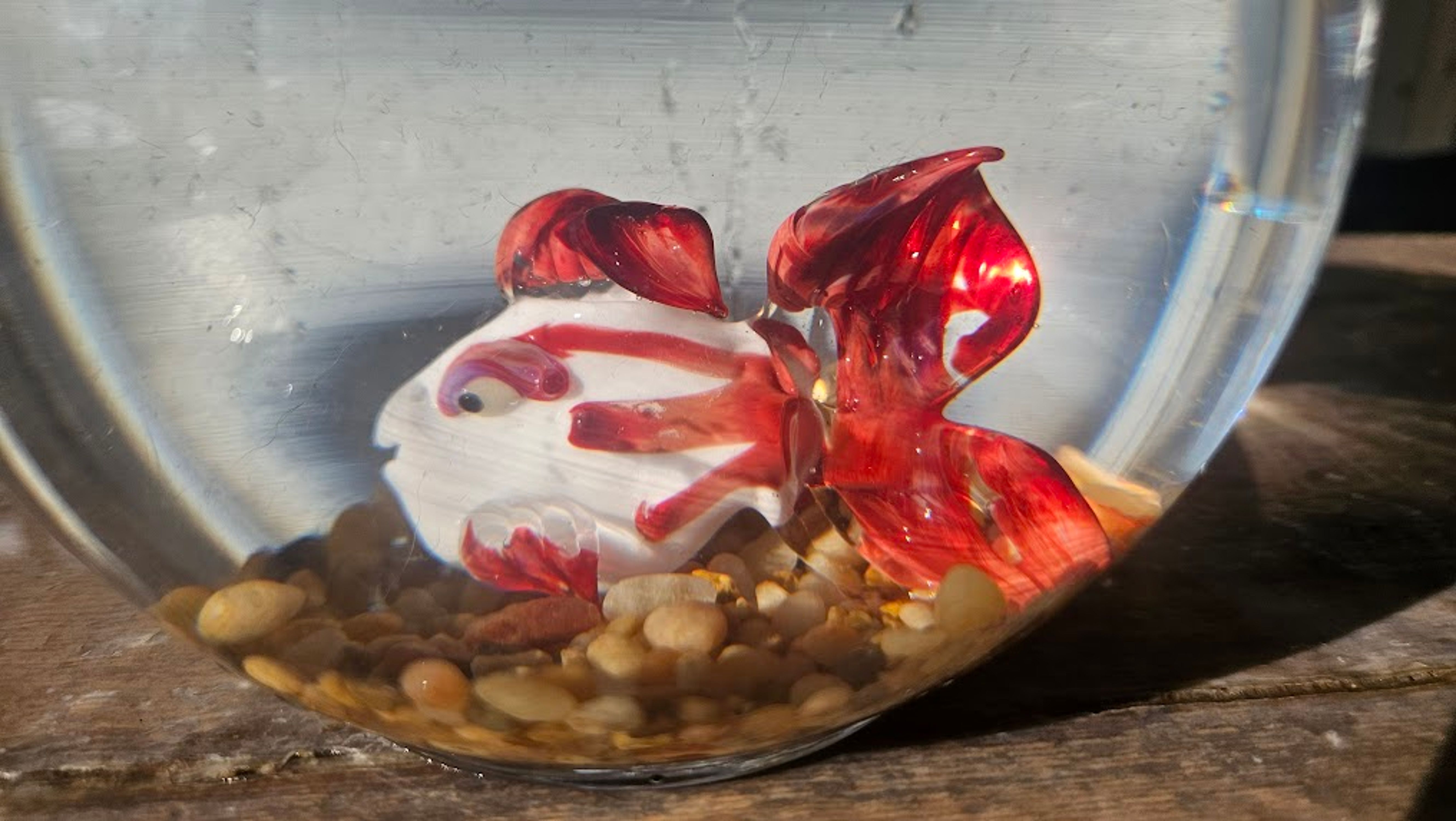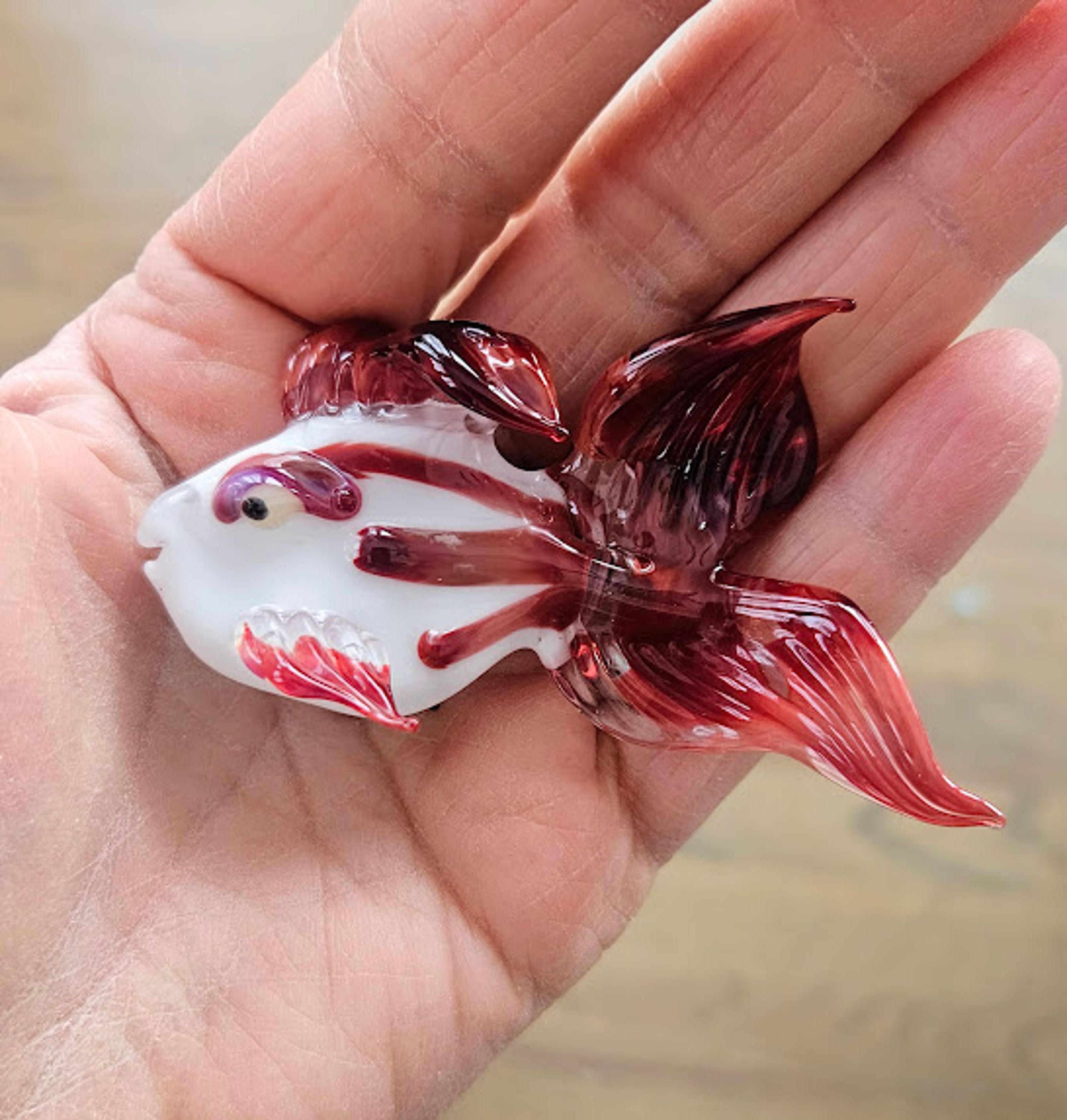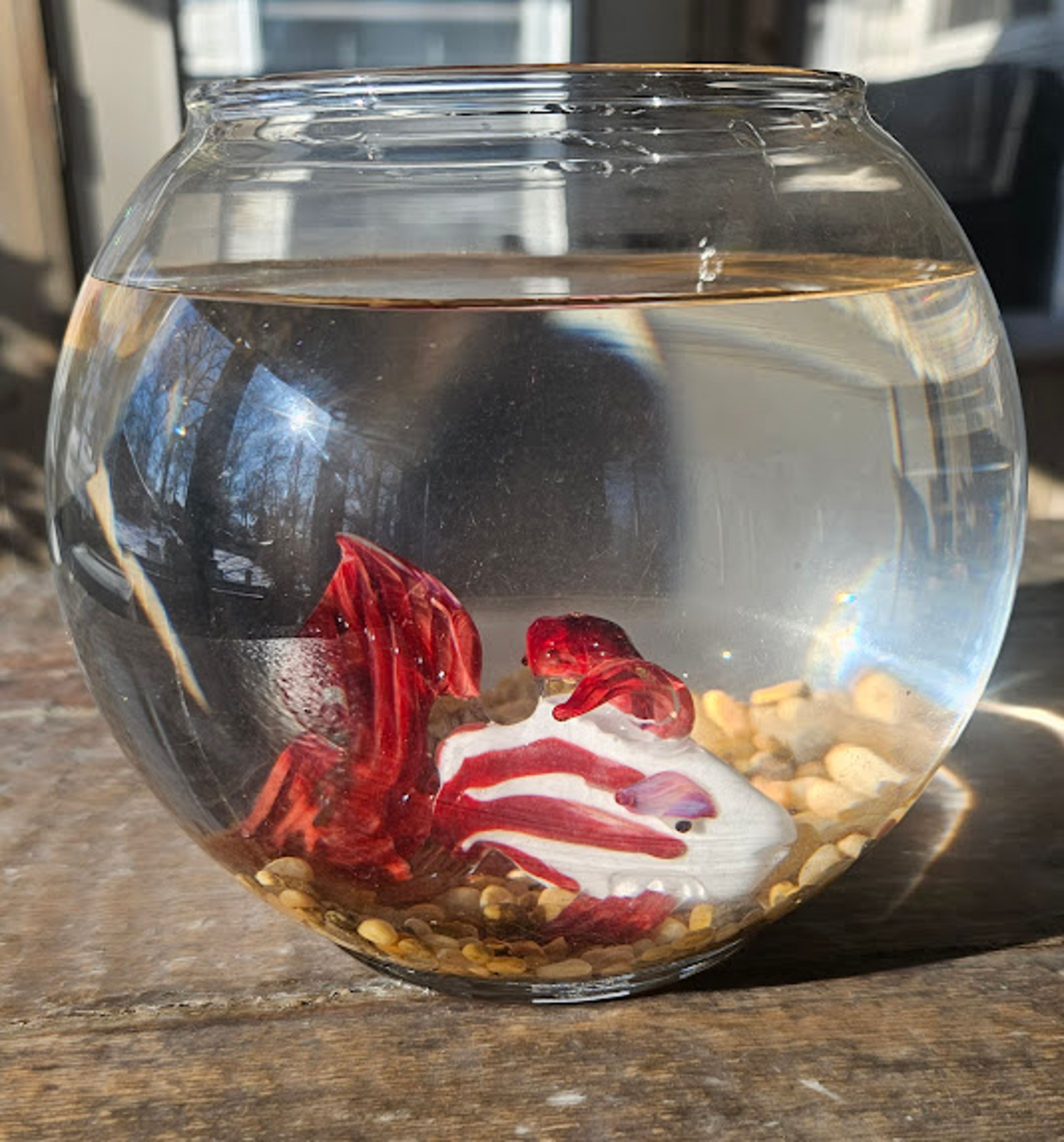 Individually hand sculpted borosilicate glass, scarlet and white Forever Fish. The fish measures 3 inches long by 1.5 inches tall by 1 1/4 inch wide. The fish comes with a locally sourced 5.5-inch glass bowl. The gravel is not included. The fish may be placed in an aquarium without harm to your fish or water environment.