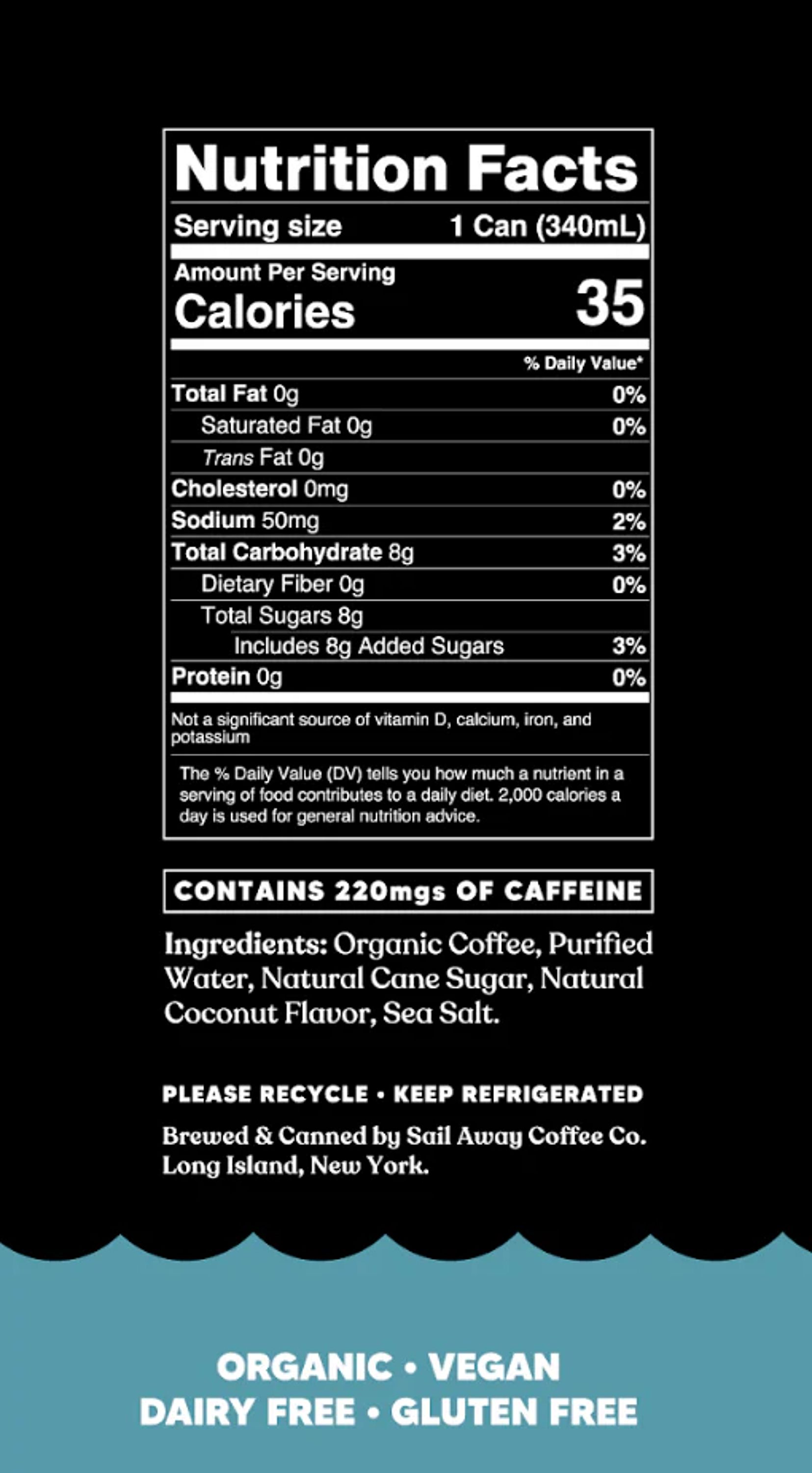 STAY BUZZED- Sail Away ORGANIC Nitro Cold Brew Coffee contains 220mg (equivalent to 3 espresso shots) of caffeine giving you the clean energy you need- morning, noon, or night.