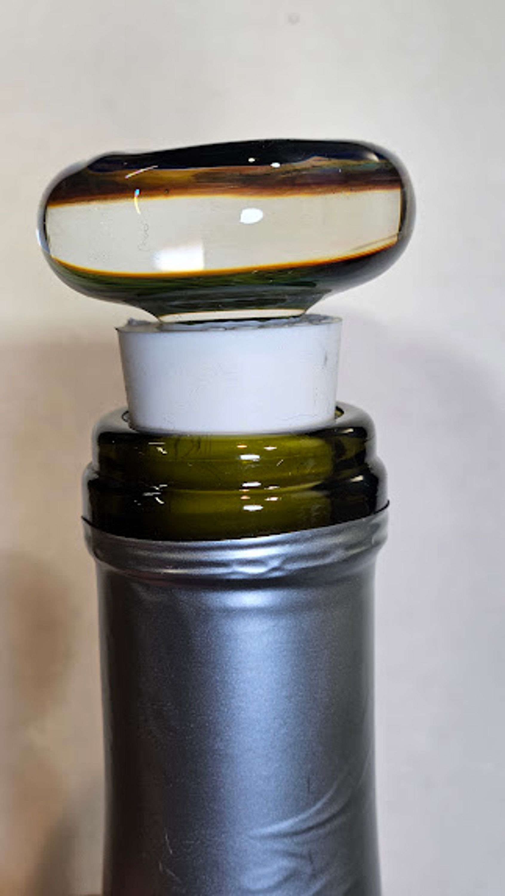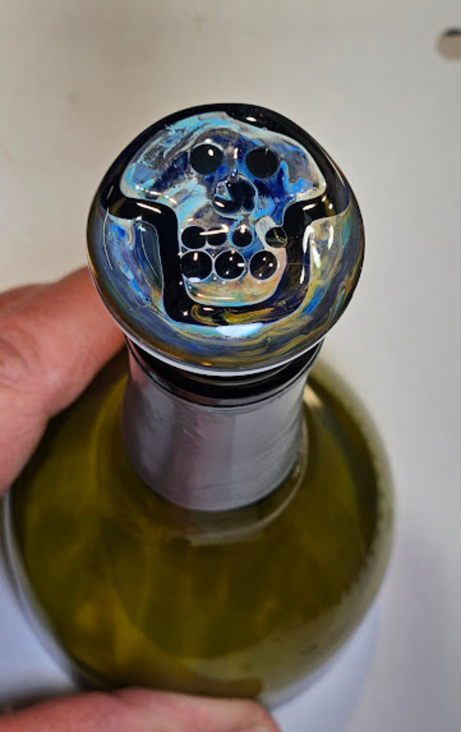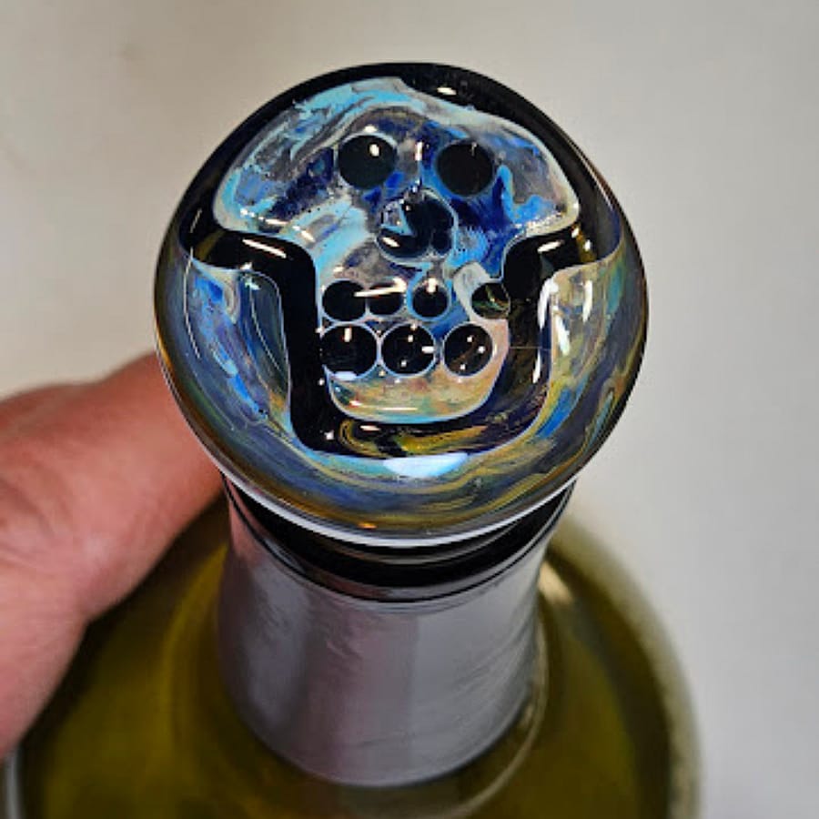 Hand sculpted iridescent skull borosilicate glass bottle stopper. It measures 2.25 inches tall and 35 mm diameter. Stoppers make great hostess/gifts and can be given with decorative olive oil or wine bottles. A size 2 stopper tapers to fit in standard wine and olive oil bottles. It tapers 20 to 16 mm. The cork can be removed and replaced as needed over time. Either cut or wet and twist off and press on a new one. Make sure to wet bottom to press a replacement cork on. Hand wash. Recommended for use with non-carbonated beverages.