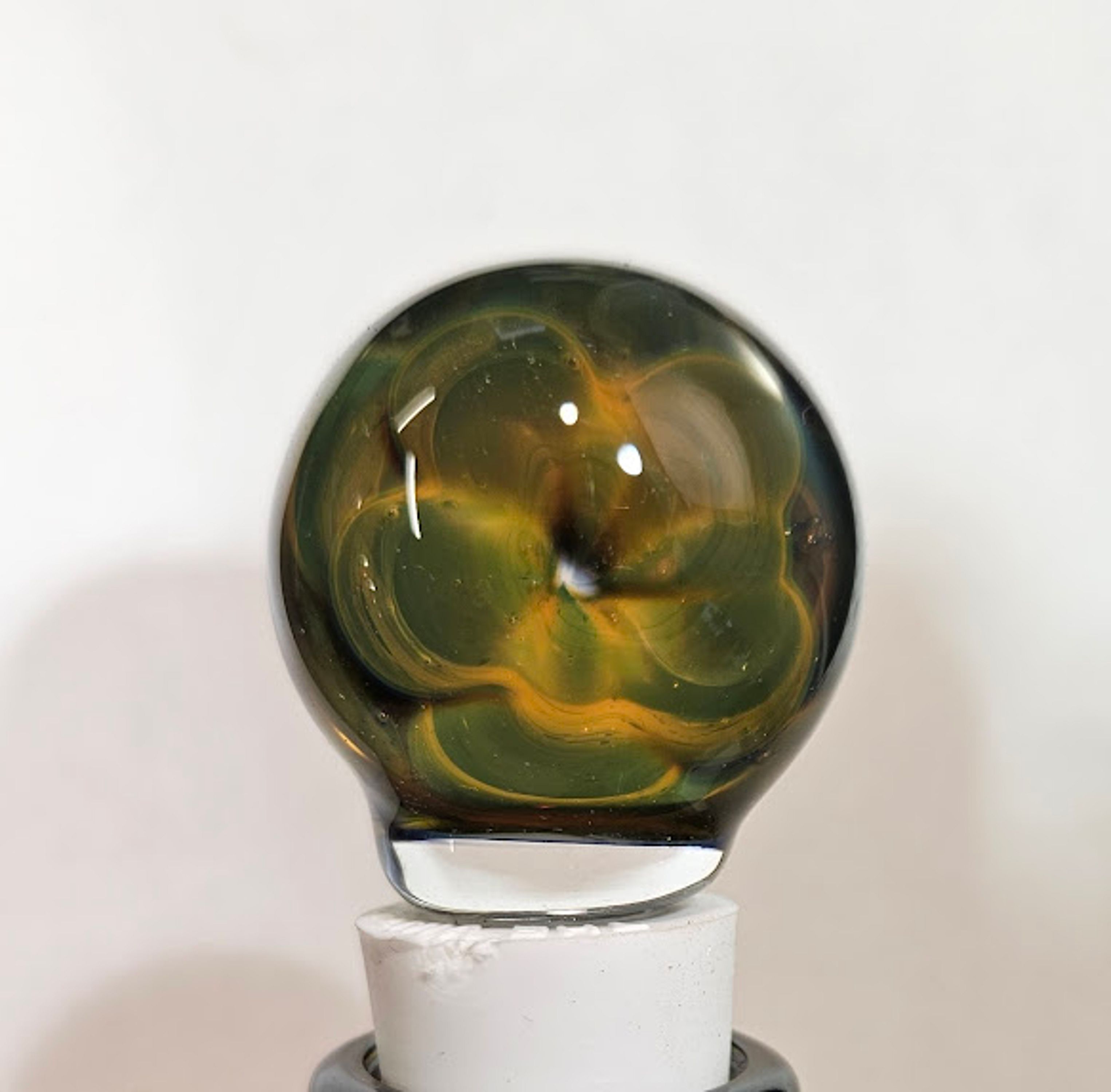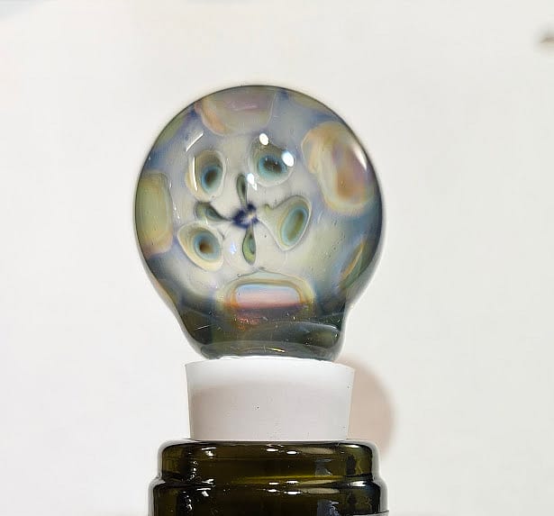 Hand sculpted light multi and green multi double sided borosilicate glass bottle stopper. It measures 2.75 inches tall and 30 mm diameter. Stoppers make great hostess/gifts and can be given with decorative olive oil or wine bottles. A size 2 stopper tapers to fit in standard wine and olive oil bottles. It tapers 20 to 16 mm. The cork can be removed and replaced as needed over time. Either cut or wet and twist off and press on a new one. Make sure to wet bottom to press a replacement cork on. Hand wash. Recommended for use with non-carbonated beverages.