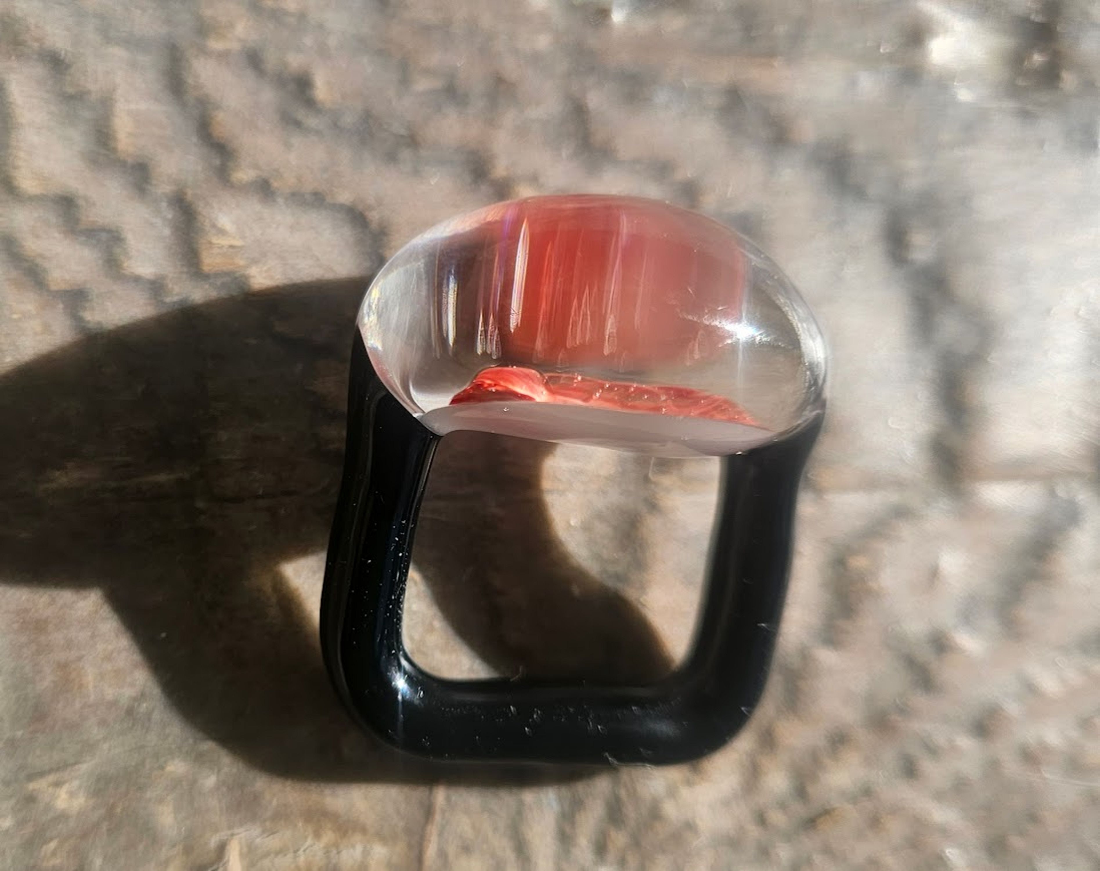 Made from durable borosilicate glass, this ring is designed to be worn and enjoyed for years. As with all glass jewelry, care should be taken—while sturdy for everyday wear, the band may break if dropped on a hard surface.