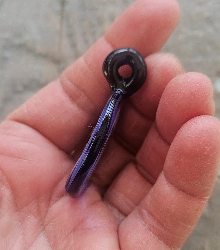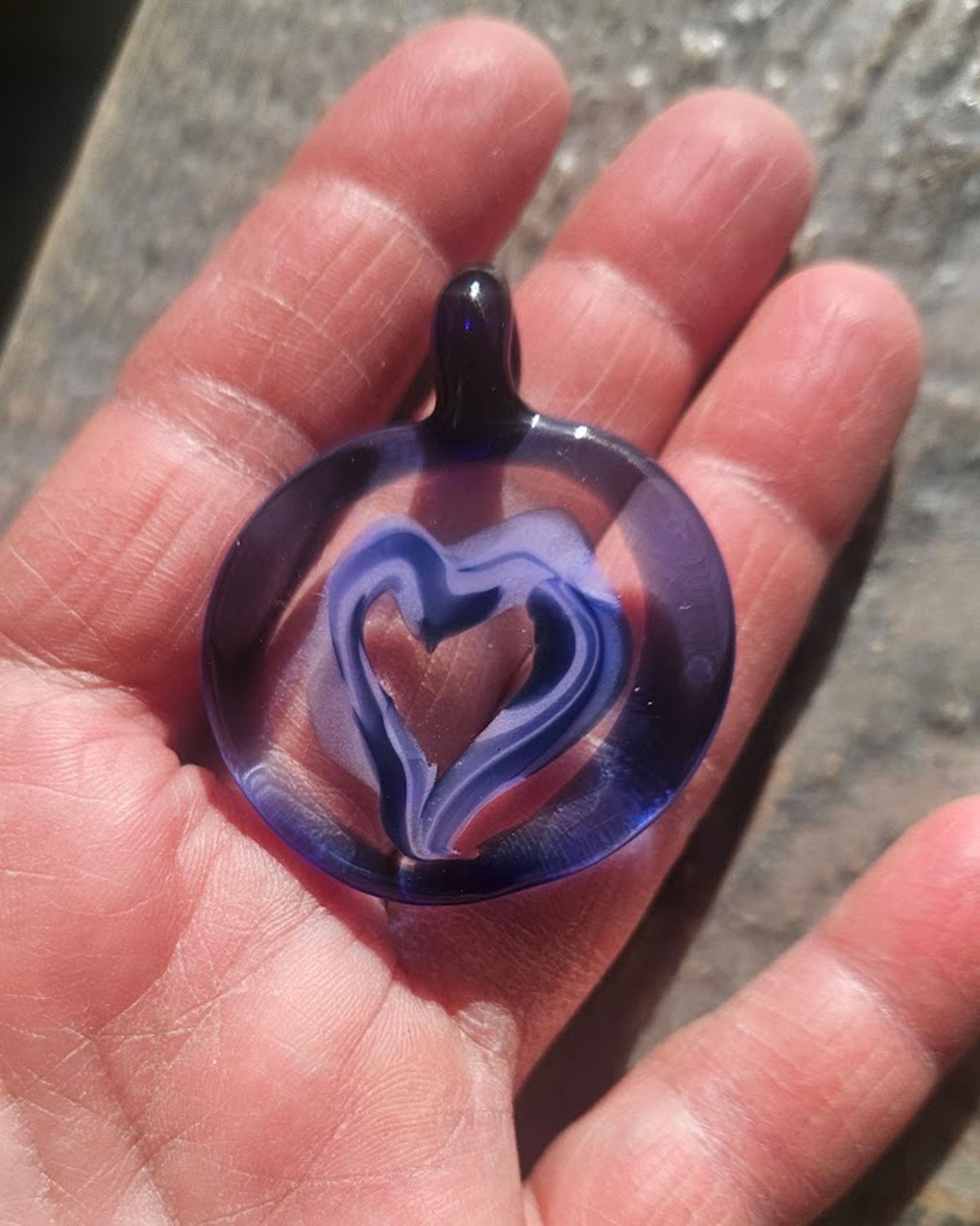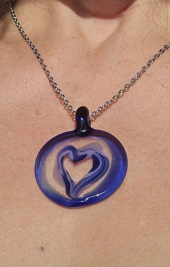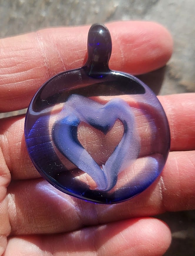 Hand-sculpted Borosilicate Glass Purple and Blue Heart Pendant with cobalt blue glass bail. One side has more purple and the other more blue swirls. It may also be used as a Sun-Catcher! It comes ready to wear. An 18-inch stainless steel chain is included. It measures 1.5 inches in diameter and 2 inches tall with bail it is approximately 1/8-inch thick. The bail hole is approximately 1/8-inch diameter. Glass jewelry is extremely durable for years of wear, but the bail may break if dropped on a hard surface.