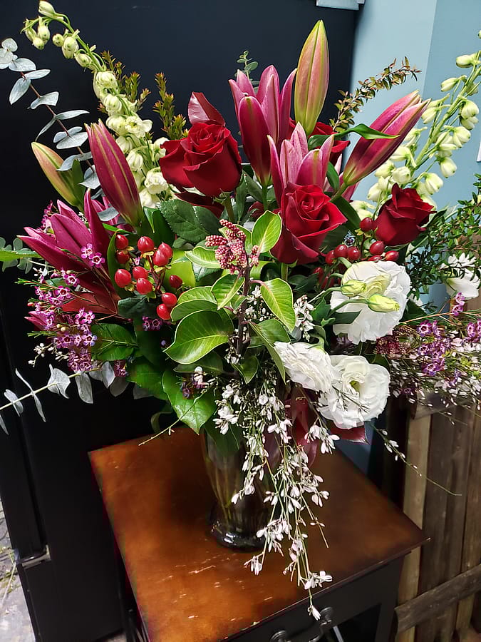 Go grandiose this Valentine's Day with our Grand Garden Urn Vase arrangement. This arrangement is bountiful with flowers handpicked from our seasonal assortment and artfully arranged by our experienced designers!
