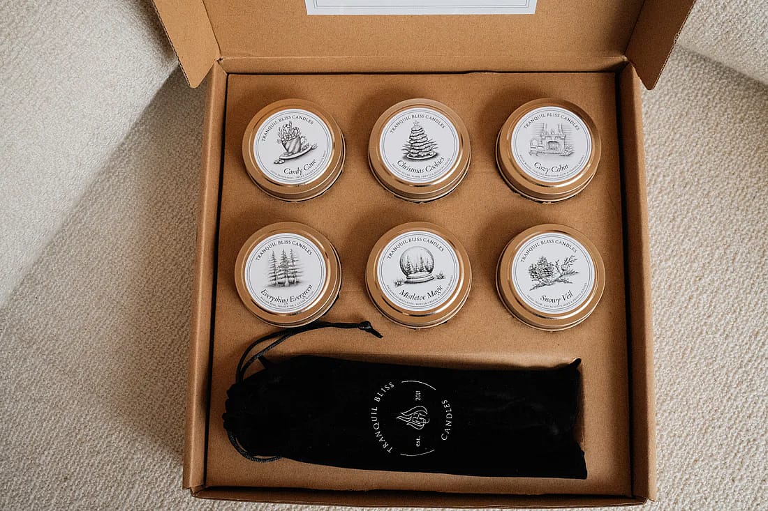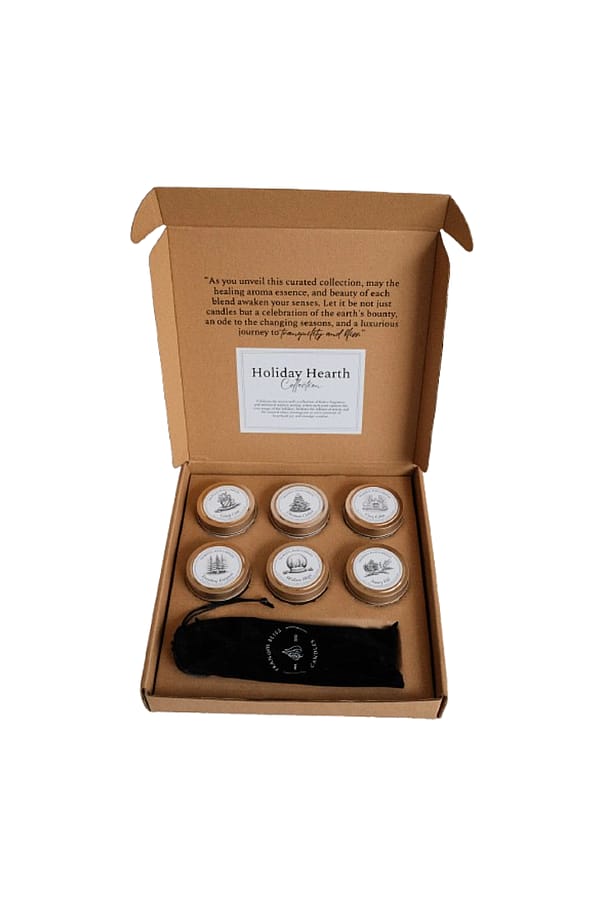 Introducing our highly anticipated Holiday Hearth Collection, thoughtfully curated for the winter season and perfect for holiday candle lovers. This beautifully designed sampler box features six generous 6oz tins, each filled with our most beloved winter fragrances: