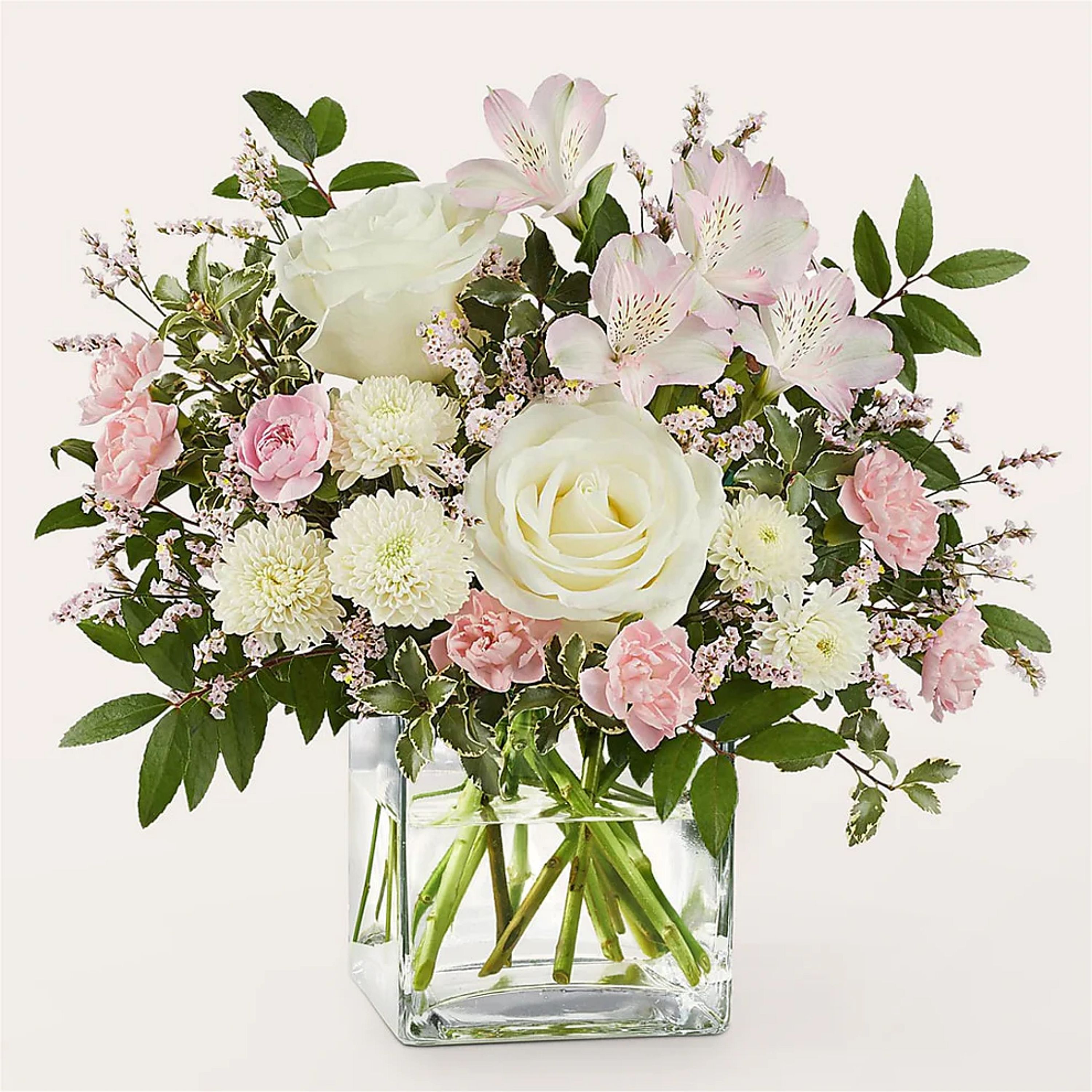 Pastel pink and white florals create a timeless display, beautifully crafted by a local florist to simply make their day.