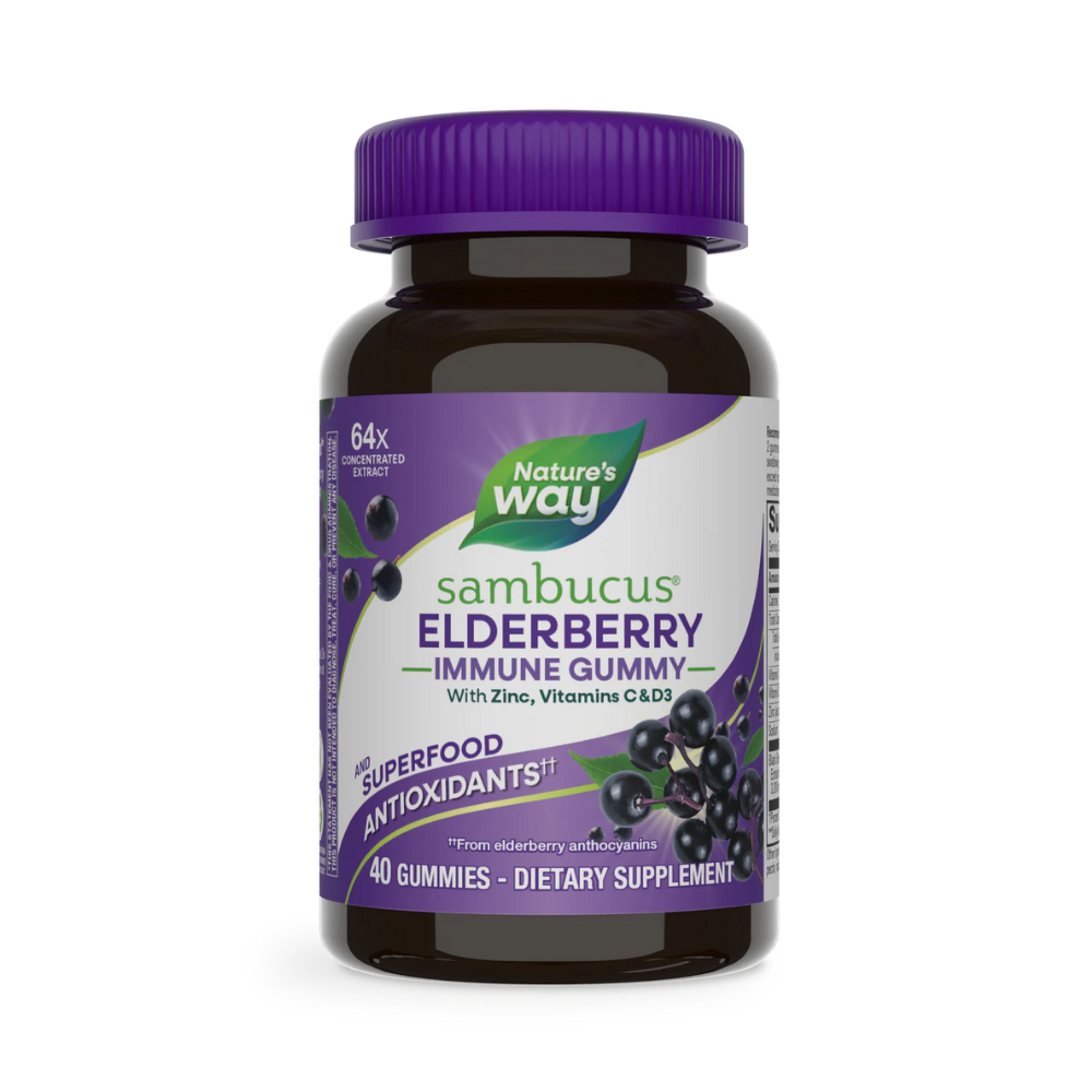 Delicious gummies, bursting with benefits. Sambucus Gummies with black elderberry extract combine zinc, 100% of the recommended Daily Value of vitamin C and 150% of the recommended Daily Value of vitamin D to support your immune system all year long. These yummy gummies are a favorite for use during back to school season and in the winter months. Dairy Free, Gluten Free, Vegetarian.