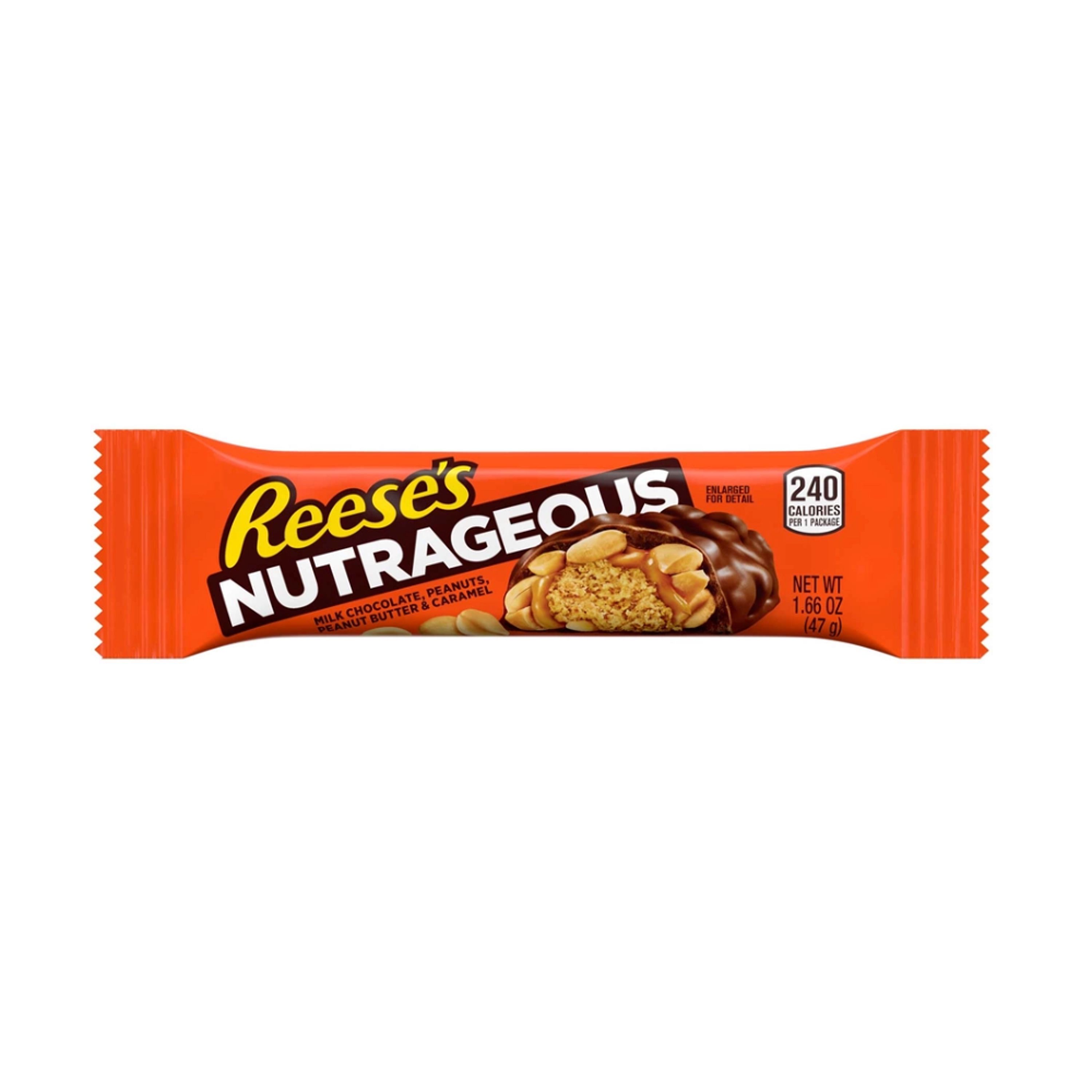 If candy bars were rock concerts, “Reese's peanut butter center” would be this one's headliner. Reese's Nutrageous Bar is loaded with rich chocolate, smooth peanut butter, sweet caramel and crunchy peanuts.