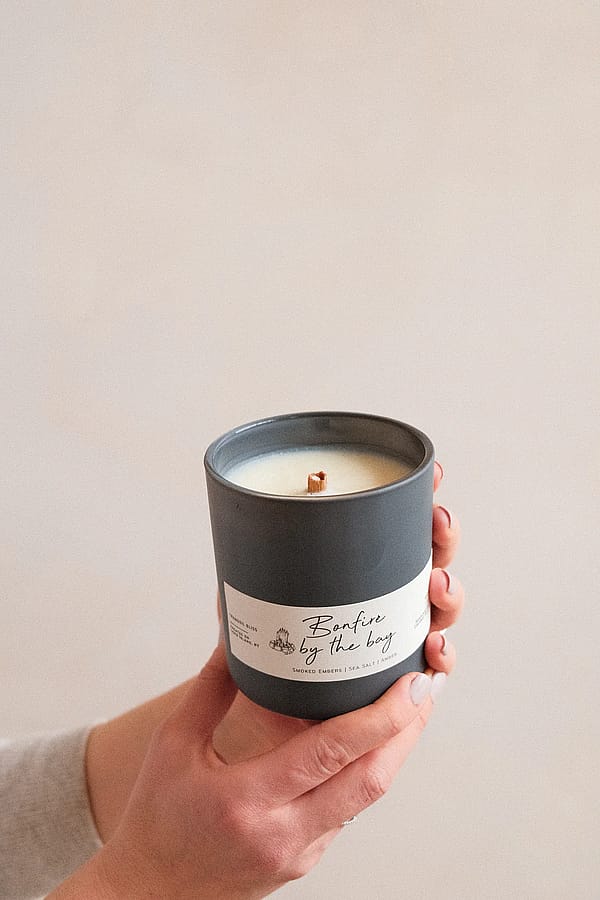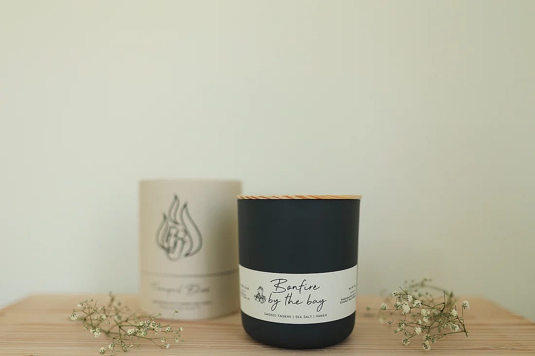 Matte Charcoal Jar: Housed in a chic Matte Charcoal jar, setting the tone for a cozy evening by the bay.