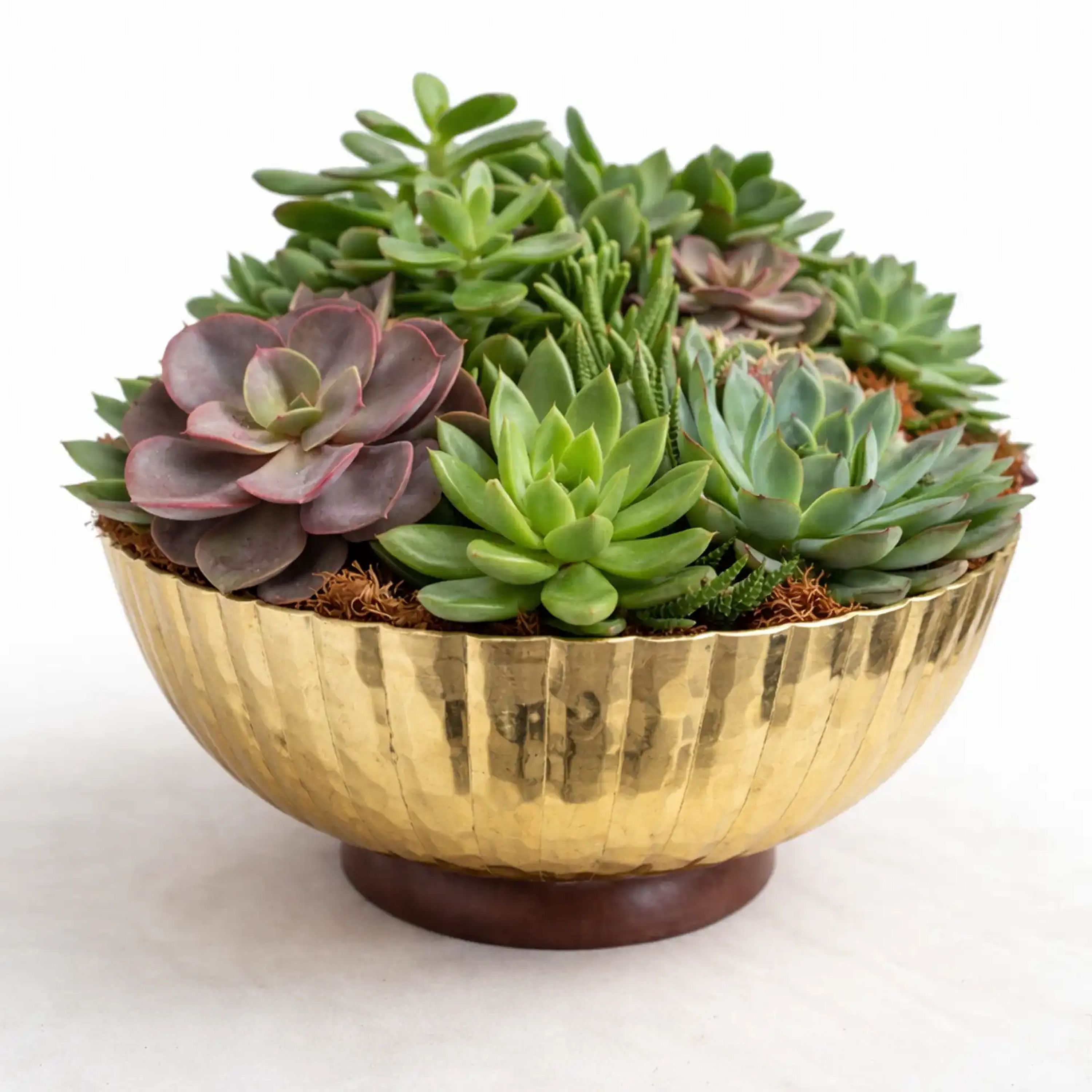 A collection of vibrant premium succulents in a 12-inch gold dish, featuring a variety of textures and colors. Only one available
