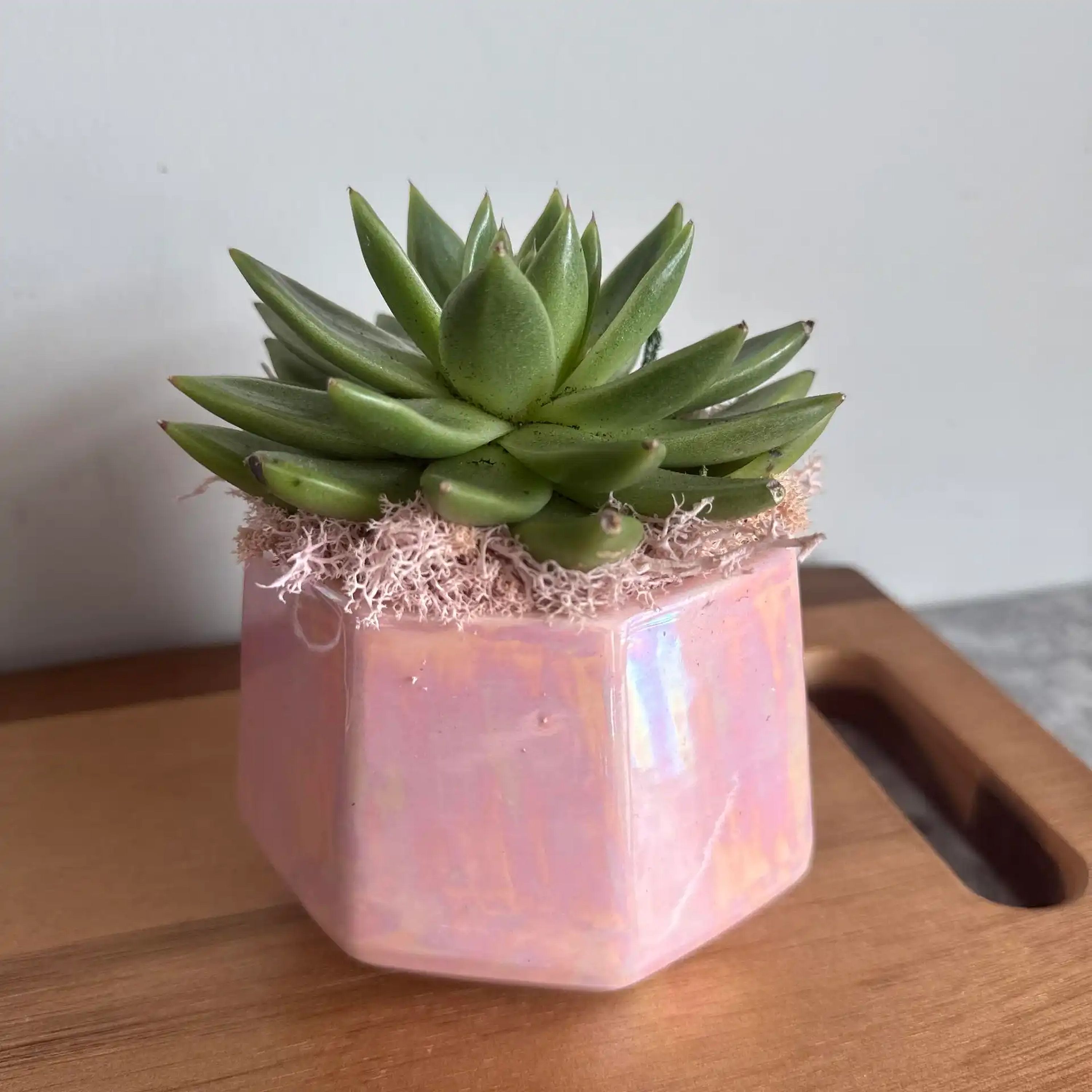 A charming mini echeveria succulent nestled in a pink 5" ceramic prism. This low-maintenance plant adds a touch of greenery and elegance to desks, shelves, and small spaces. Perfect for gifting, home décor, party favors, or office accents.