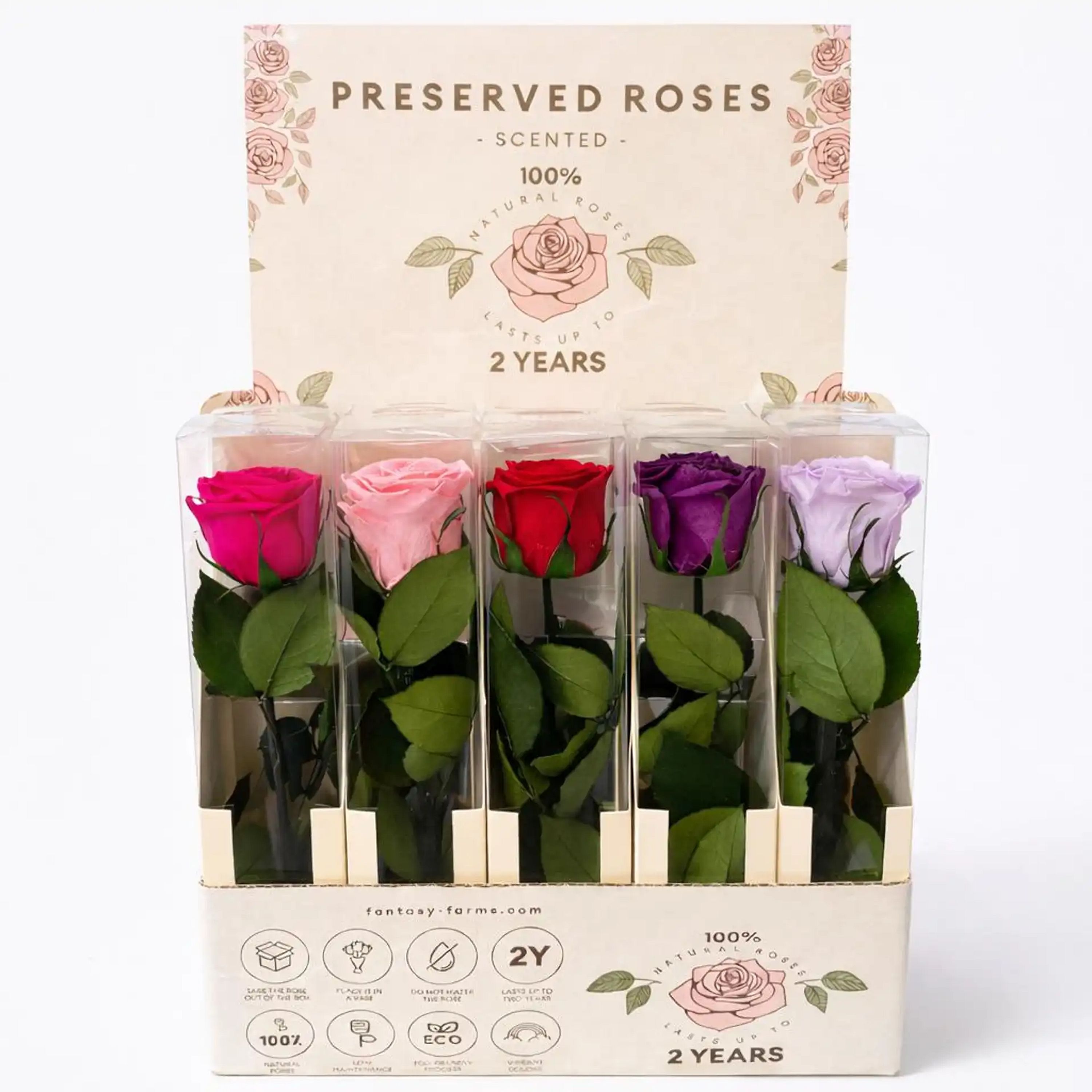 A vibrant lilac rose preserved on a long stem, maintaining its natural beauty and elegance. #vday26