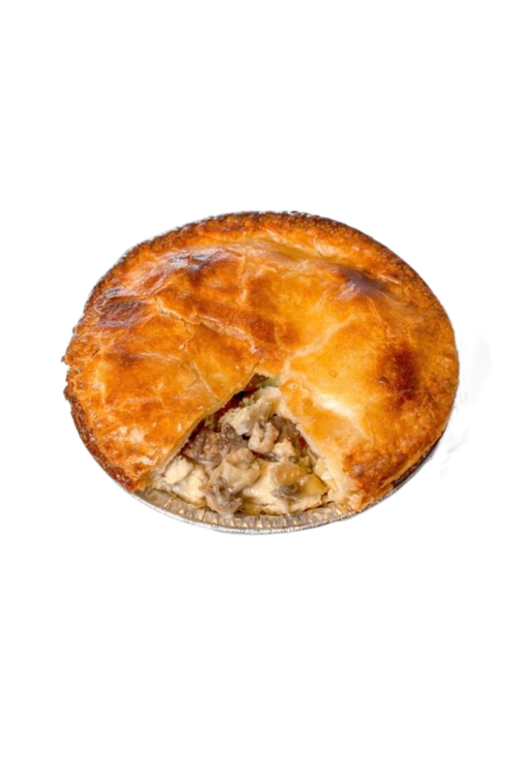Our delicious traditional English pub pie. Mixed with white meat chicken, portobello, porcini and button mushrooms with celery, carrots, and onions all together to create amazing flavors. Fully cooked, warm in the oven for 20-25 minutes at 300 degrees
