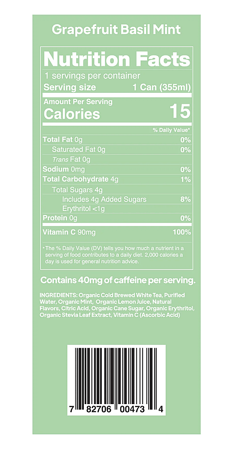 Escape the norm and crack open a world of herbaceous, citrus adventure. Organic Cold Brewed White Tea Contains Vitamins (a fully daily dose of Vitamin C) + Antioxidants 15 Calories 4g Sugar 40mg Caffeine
