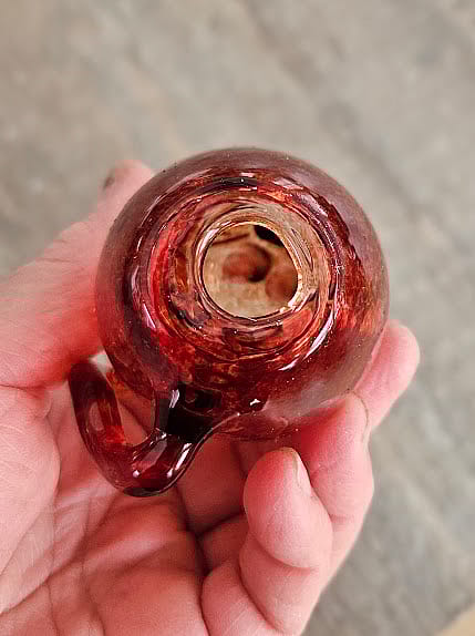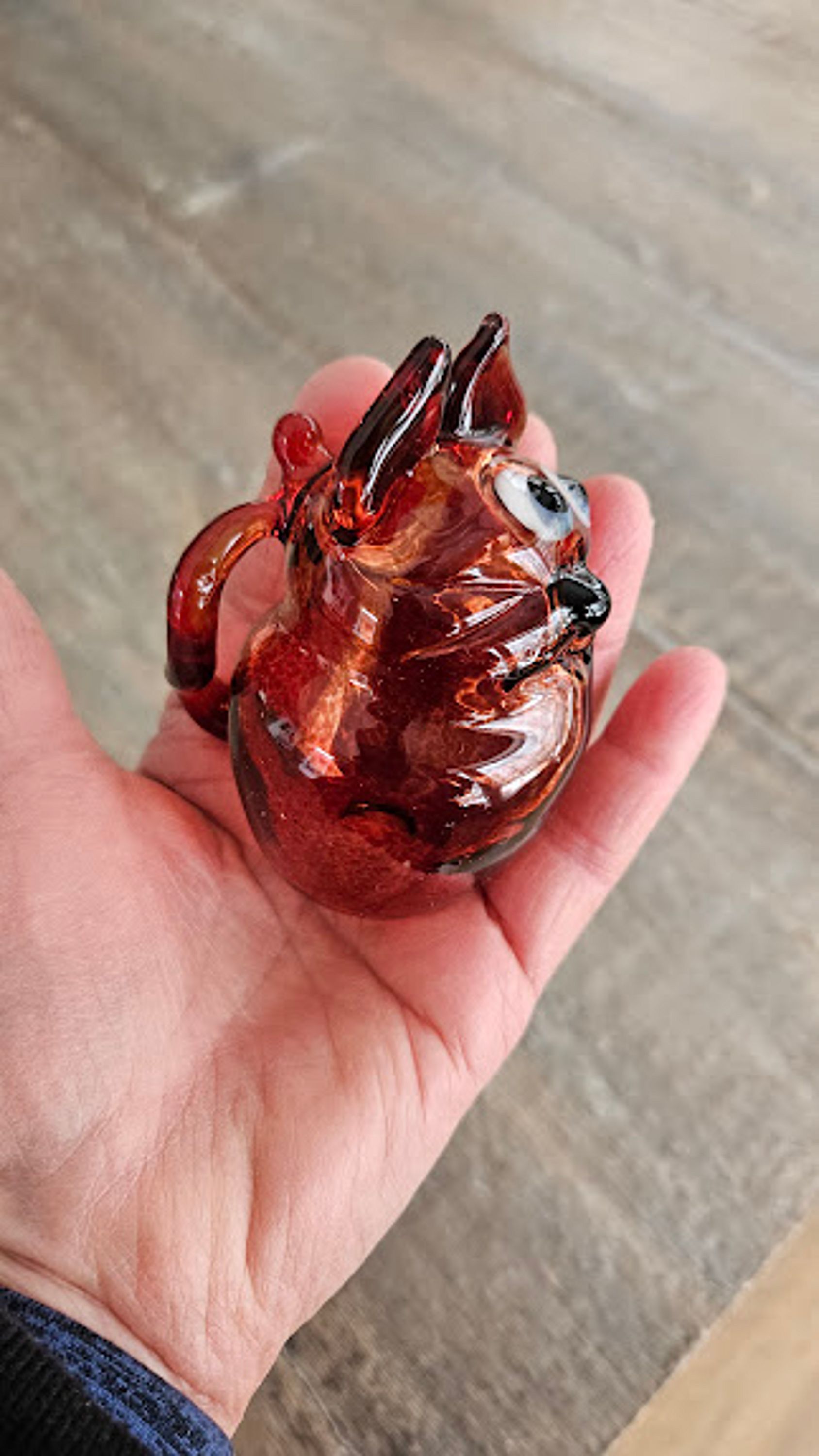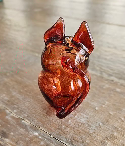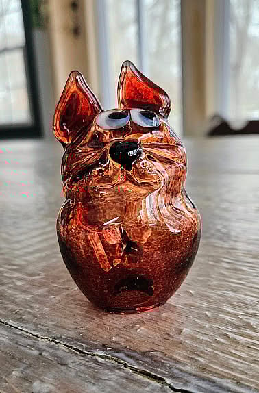Hand-blown borosilicate Elivis Red glass cat sculpture. It measures 3.5 inches tall by 2.5 inches deep by 2 inches wide.