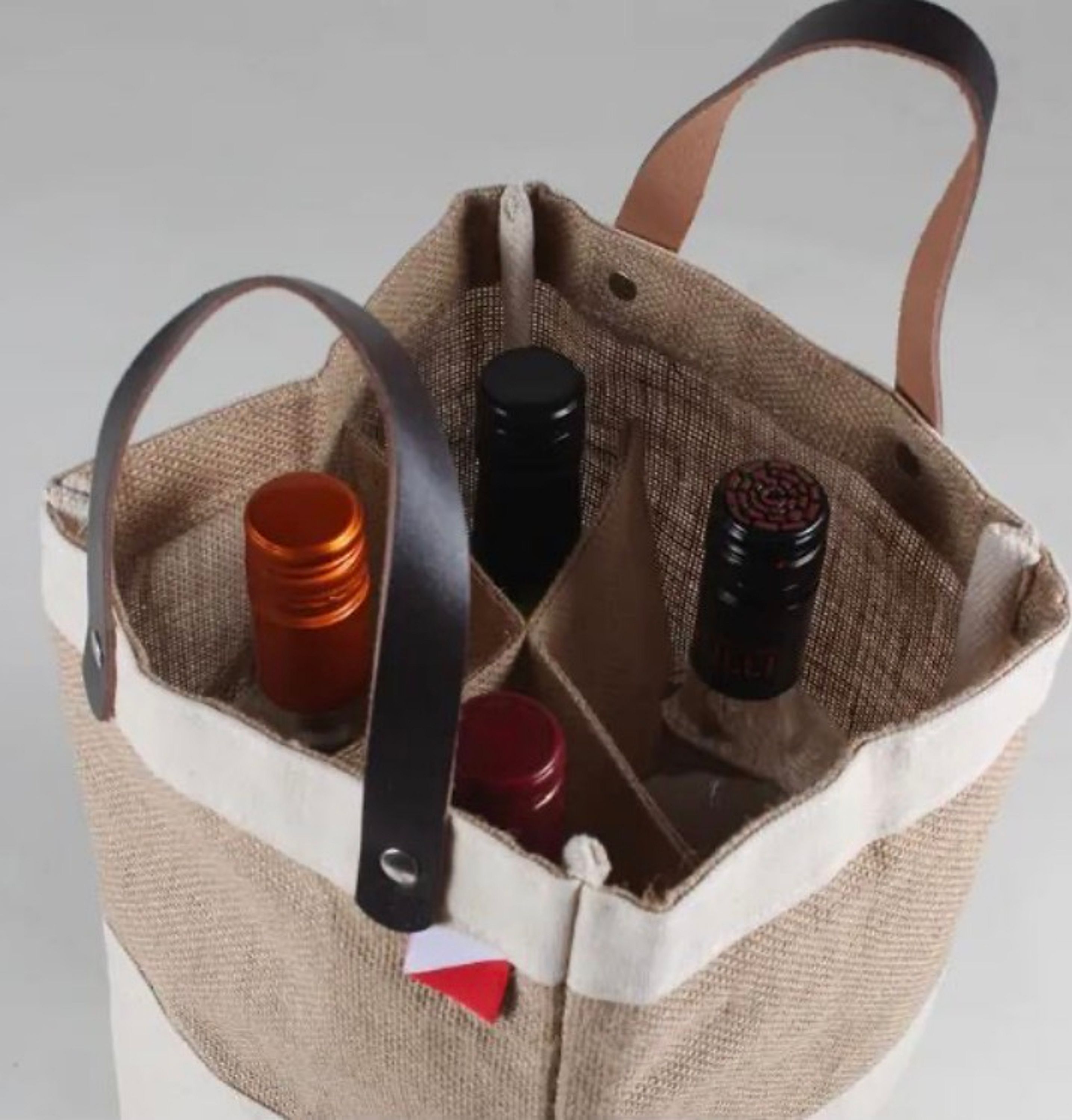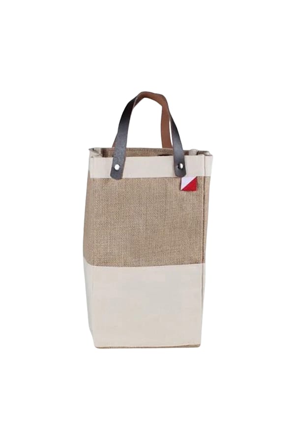 Give your tote-ables an upgrade! This jute and canvas tote with leather handles holds 4 bottles. Wine, Olive Oil, Tapenade. Stuff one today! Dimensions: 7" x 7" x 11"
