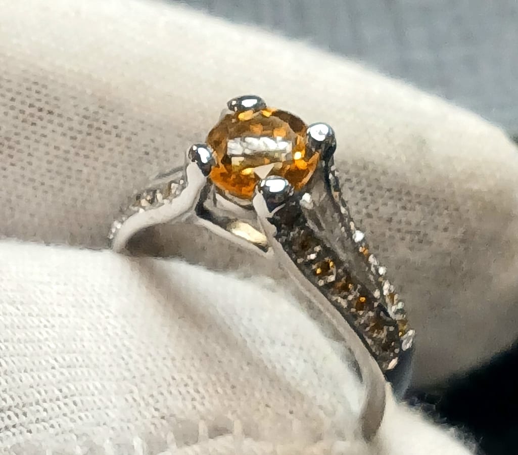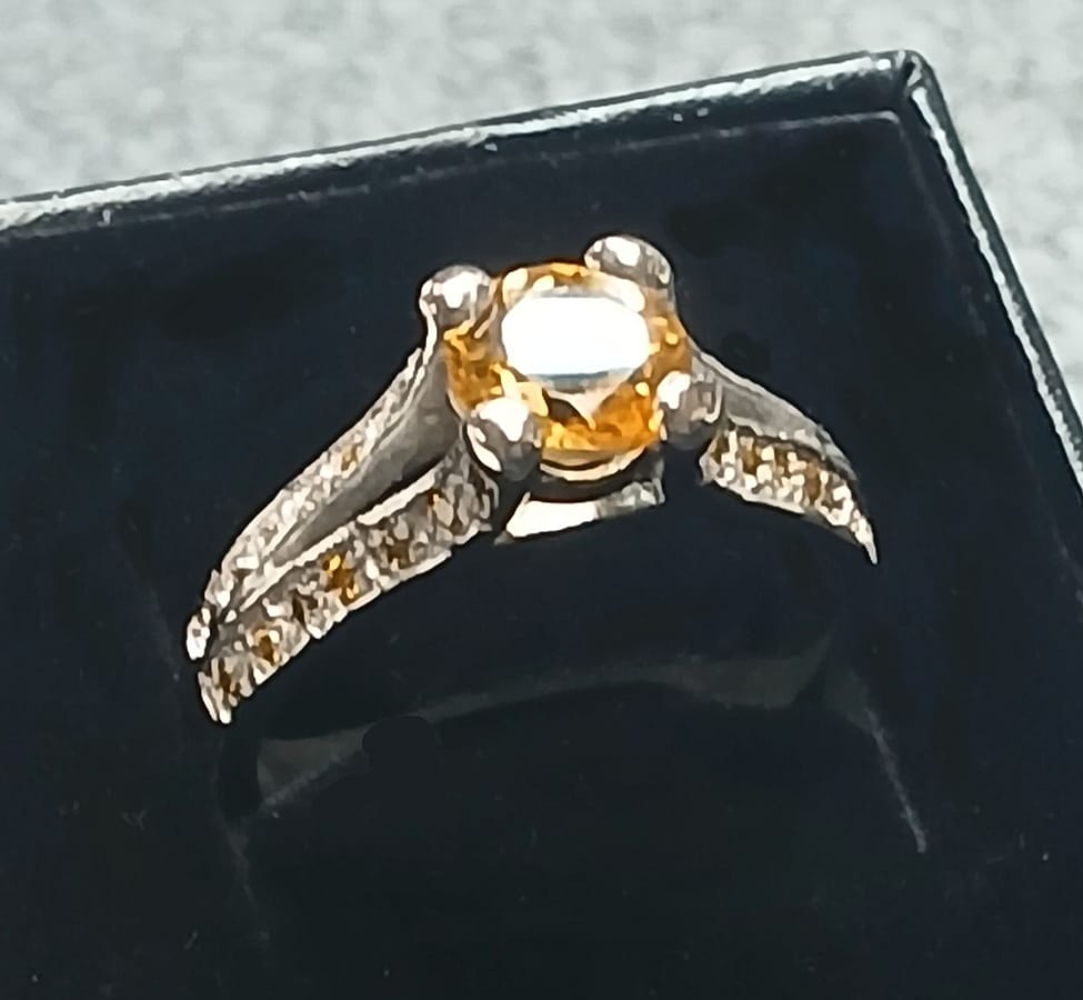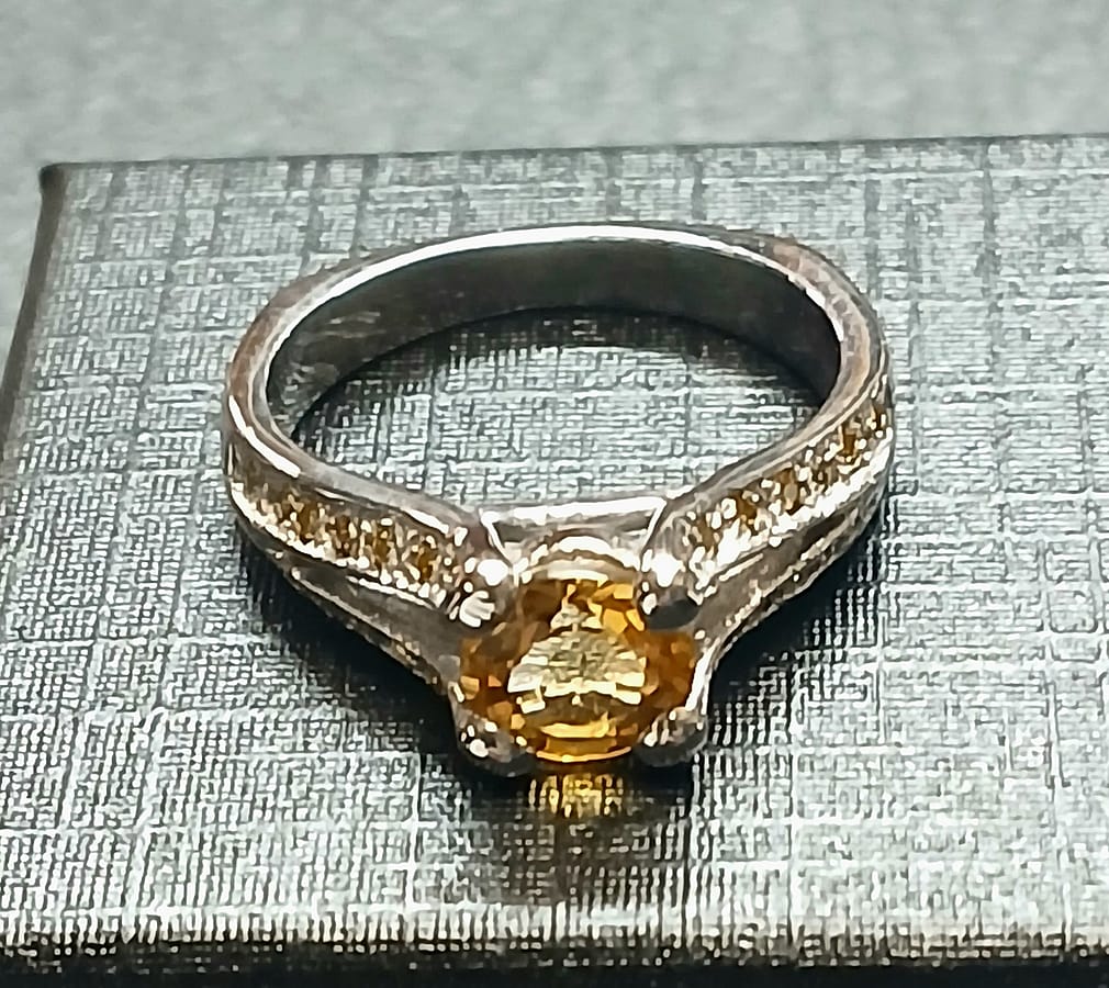 Silver moissanite ring with citrine center stone