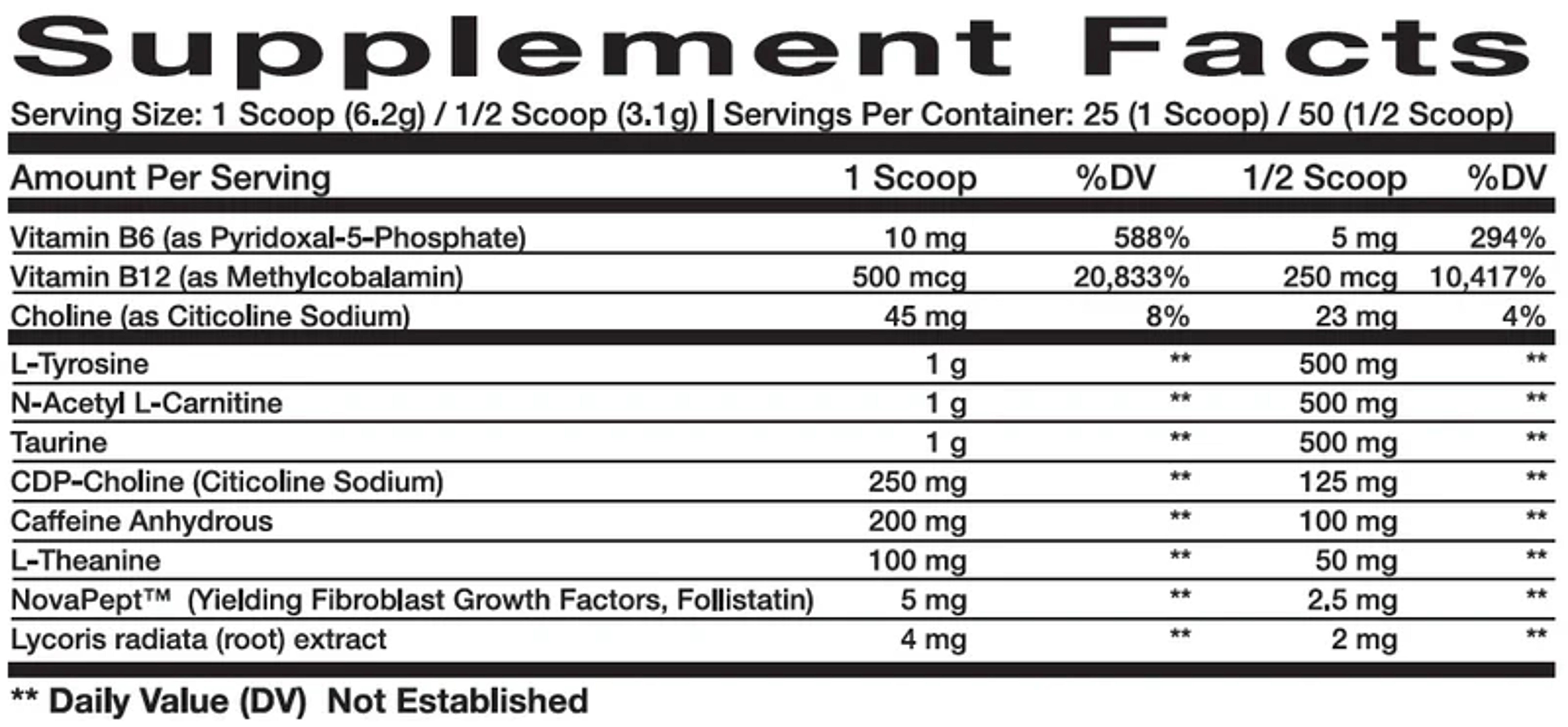 The ingredients and dosages selected for InnovaPharm’s Novatropic include a gram each of taurine, tyrosine, and n-acetyl-l-carnitine, 100mg of energy-smoothing theanine, 250mg of citicoline, B vitamins, and our preferred amount of caffeine for an anytime nootropic at 200mg. There are a couple of rarities in the mix on this one, too, by way of 4mg of lycoris radiata extract to help prevent the breakdown of choline and further enhance cognition and 5mg of NovaPept, a peptide-based technology made up of growth factors that specifically encourage brain development, maintenance, and repair.