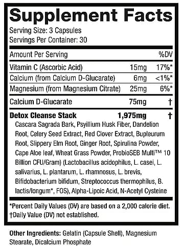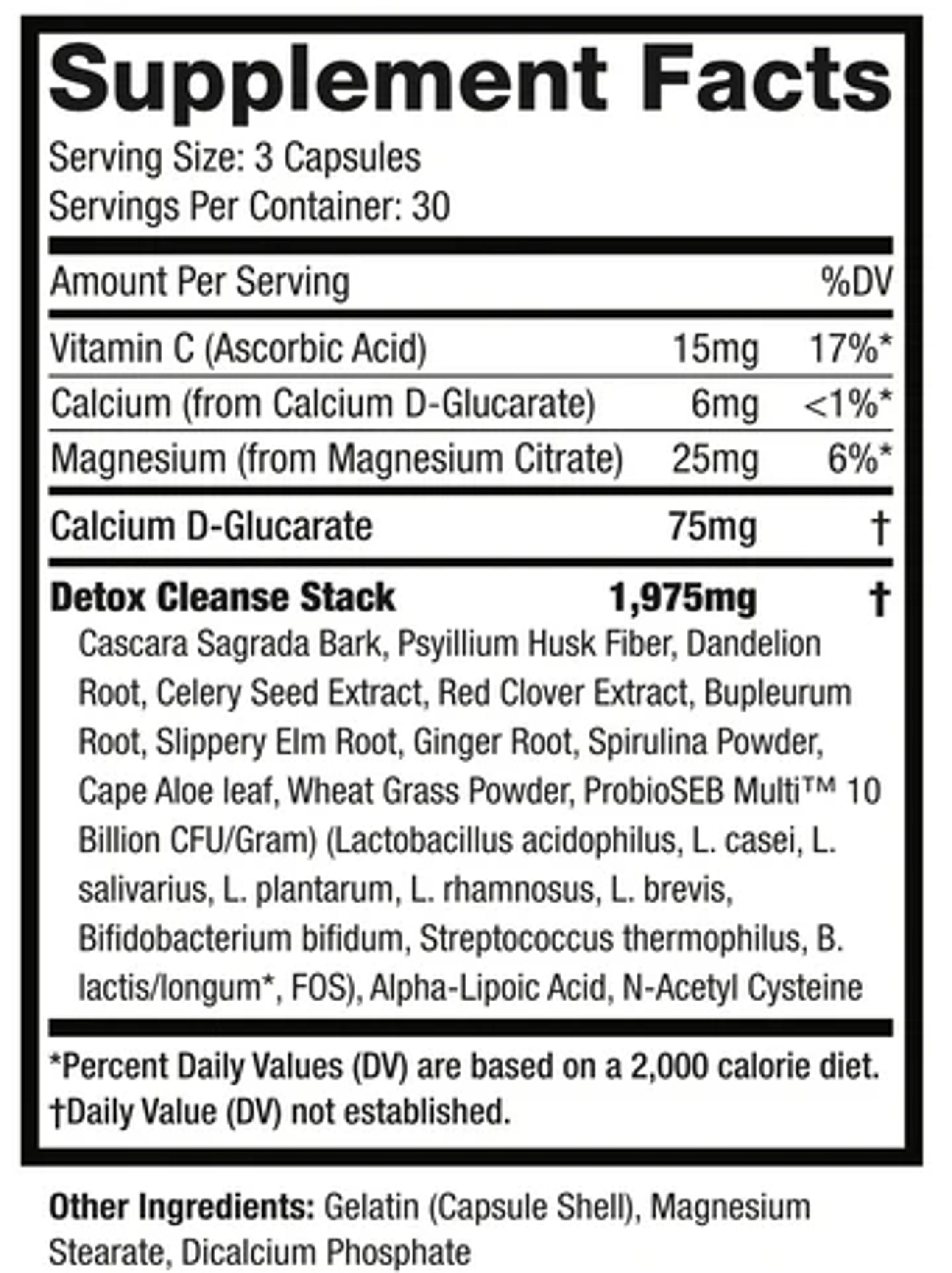 Calcium D Glucarate, DETOX CLEANSE STACK- Psyillium Husk, Cascara Sagrada, Celery Seed Extract, Red Clover Extract, Dandelion Root, Bupleurum Root, Triphala, Slippery Elm Bark, Ginger Root, N-Acetyl-Cysteine, Cape Aloe Leaf, Alpha Lipoic Acid, Spirulina, Wheatgrass, Lactobacillus Acidophilus