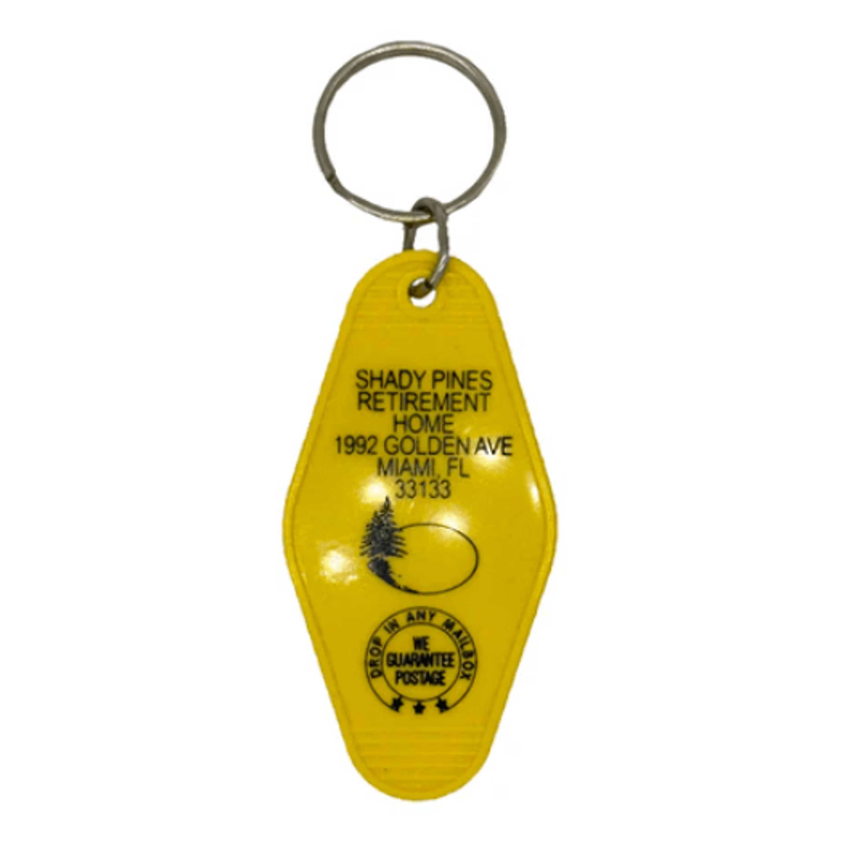 Shady Pines Keychain is a retro-style motel tag keychain inspired by the Golden Girls Shady Pines Retirement Home. This nostalgic accessory features a classic motel key-tag design with green background and gold lettering, paired with a sturdy metal key ring to keep keys secure. It’s a fun, everyday carry item or gift for fans of classic TV and vintage travel aesthetics.
