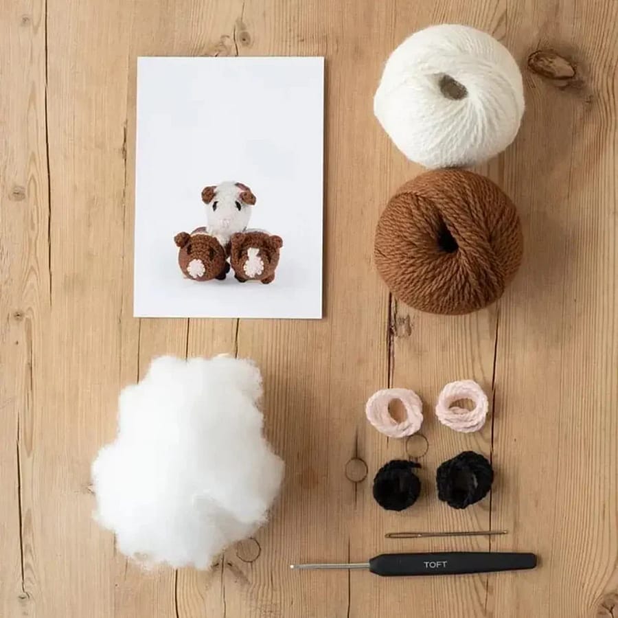 This mini guinea pig crochet kit contains enough yarn to make three guinea pigs, allowing you to mix and match your colors to customize their markings and match your own pets. Did you know that these lovable critters don't actually come from Guinea, and they are not related to pigs either!