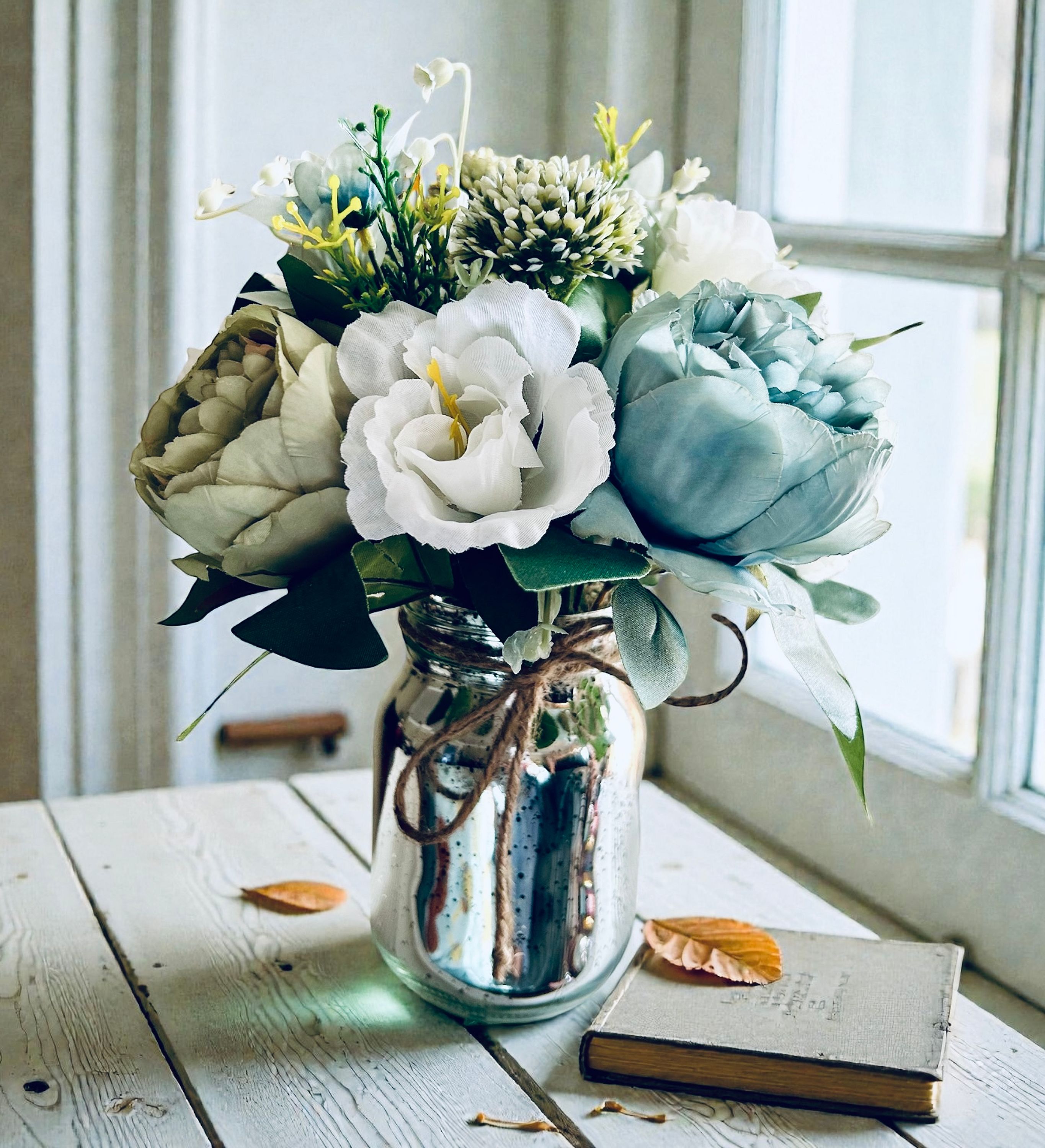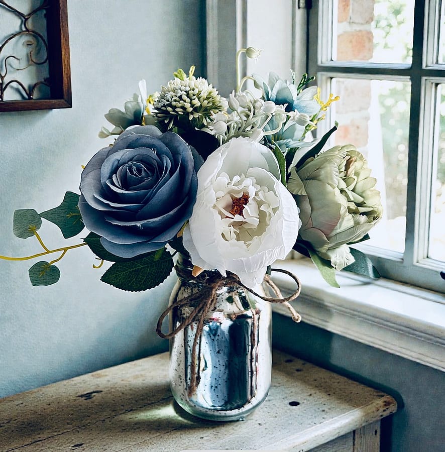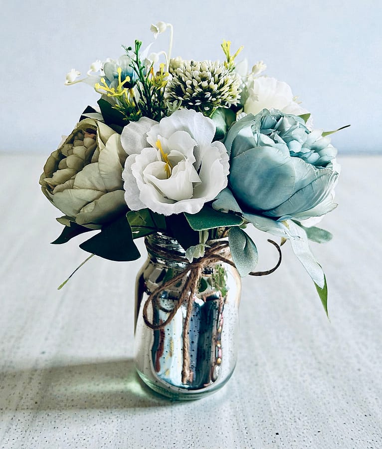 This precious bouquet of silk flowers was created in shades of blues and greens. It is set in a silver Mercury glass jar finished with a natural bow.