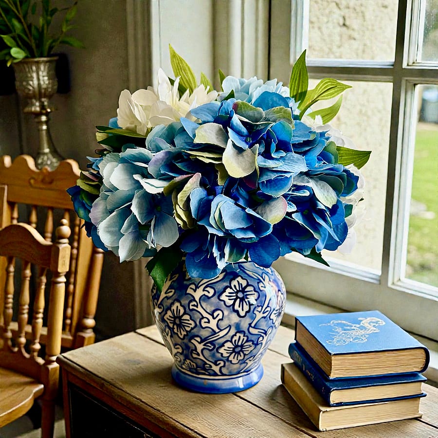 This beautiful blue and white vase was decorated with 9 gorgeous silk hydrangea heads in shades of blues and white with eucalyptus leaf accents. It measures 12H x 12W and the vase is approx 6” tall.
