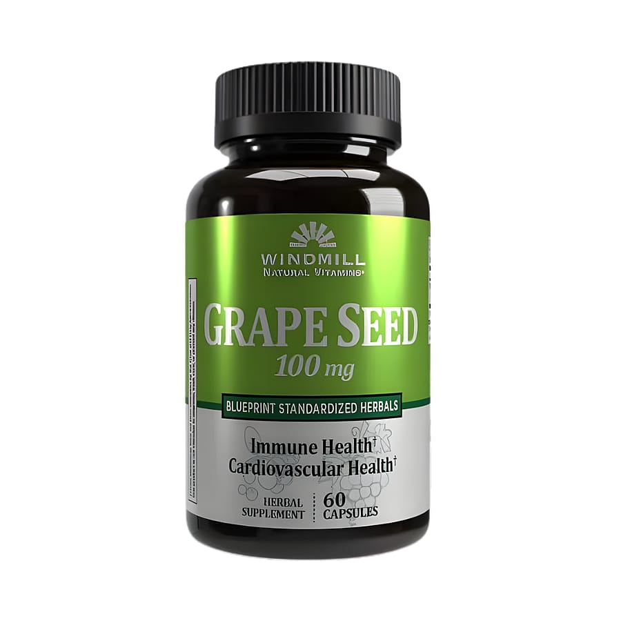 Windmill Grape Seed Extract is a powerful antioxidant supplement that supports heart health and immune defense. With 100 mg of potent grape seed extract per capsule, this formula helps protect against oxidative stress and promotes circulatory health. Windmill Grape Seed Extract 100 mg Capsules deliver powerful antioxidant support for heart, skin, and cellular health. Grape seed extract is rich in oligomeric proanthocyanidins (OPCs), which protect against oxidative stress, support circulation, and maintain youthful-looking skin. Each bottle contains 60 capsules, perfect for daily cardiovascular and antioxidant wellness.