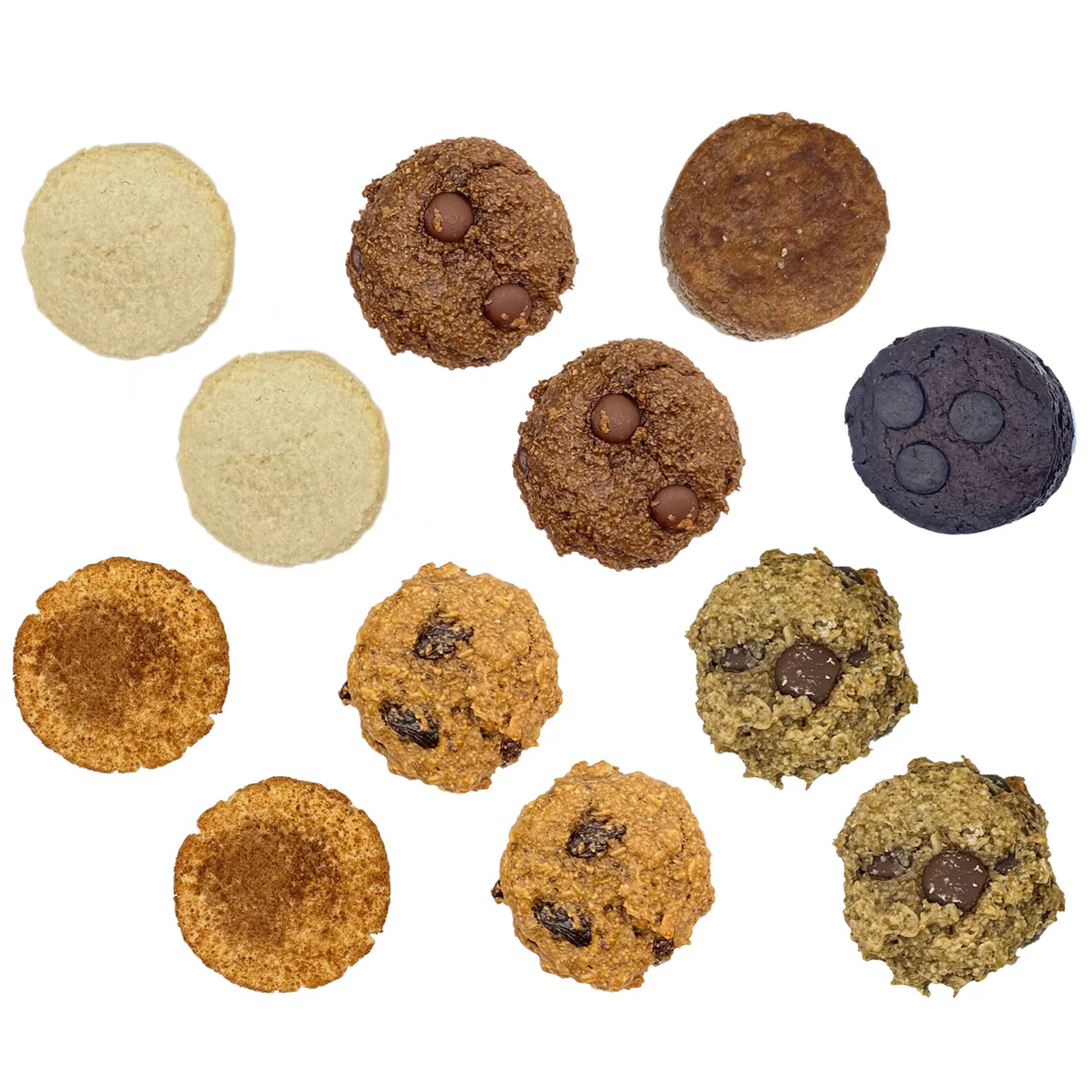 12 mixed flavor gluten free, vegan, guilt free cookies in plantbased & compostable packaging. No inflammatory oils or refined sugars - SUPERFOODS ONLY. Best way to try them all and find your favorite!