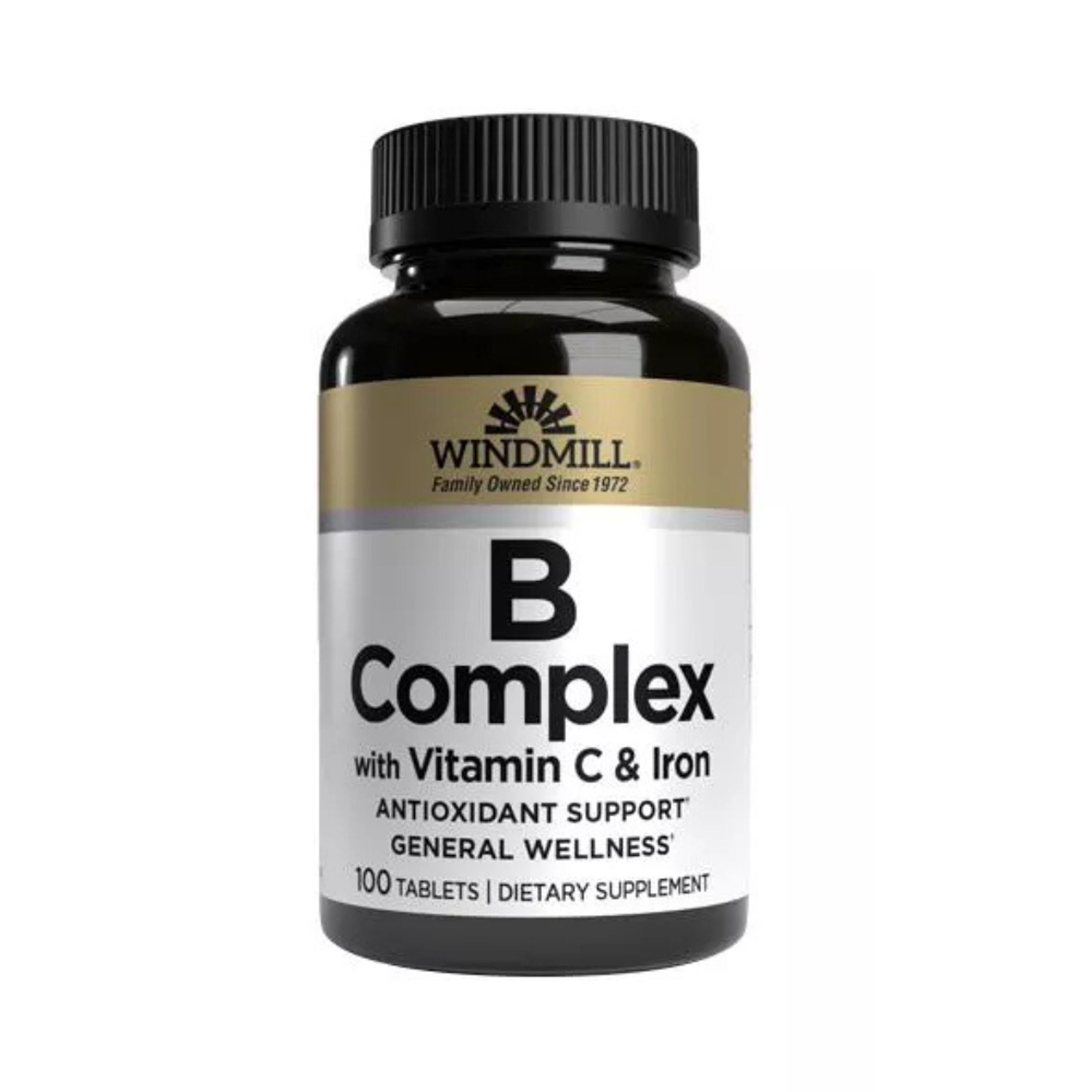 Support your daily wellness with Windmill B-Complex Tablets with Vitamin C and Iron. This balanced formula combines essential B vitamins—such as B1, B2, B6, B12, niacin, and folic acid—along with vitamin C and iron to help maintain energy levels, support red blood cell production, and enhance your immune system. B vitamins play a crucial role in converting food into fuel, making them vital for metabolism and nervous system health. Added vitamin C supports antioxidant protection and iron absorption, while iron is essential for oxygen transport in the blood. Perfect for those with demanding lifestyles, dietary gaps, or increased nutritional needs, this supplement offers a convenient way to stay on top of your health. Each bottle contains 100 tablets, providing over a three-month supply of comprehensive support for your body and mind. Windmill is a trusted name in vitamins, ensuring quality and consistency in every dose.