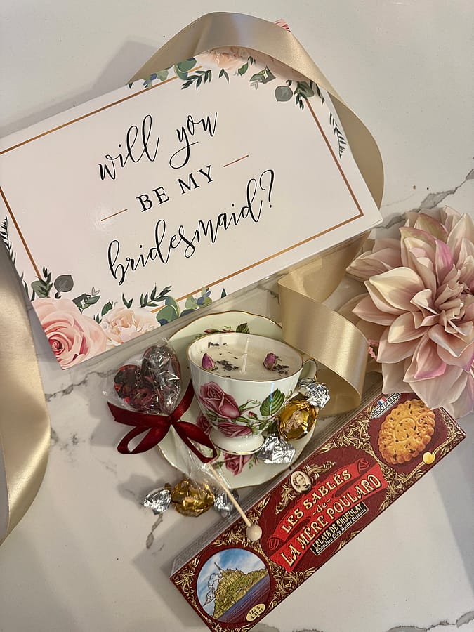 A beautiful way to ask your besties to be your bridesmaid with a soy wax lavender scented tea cup candle, box of French Cookies, chocolates & a delicious Brew Pop!