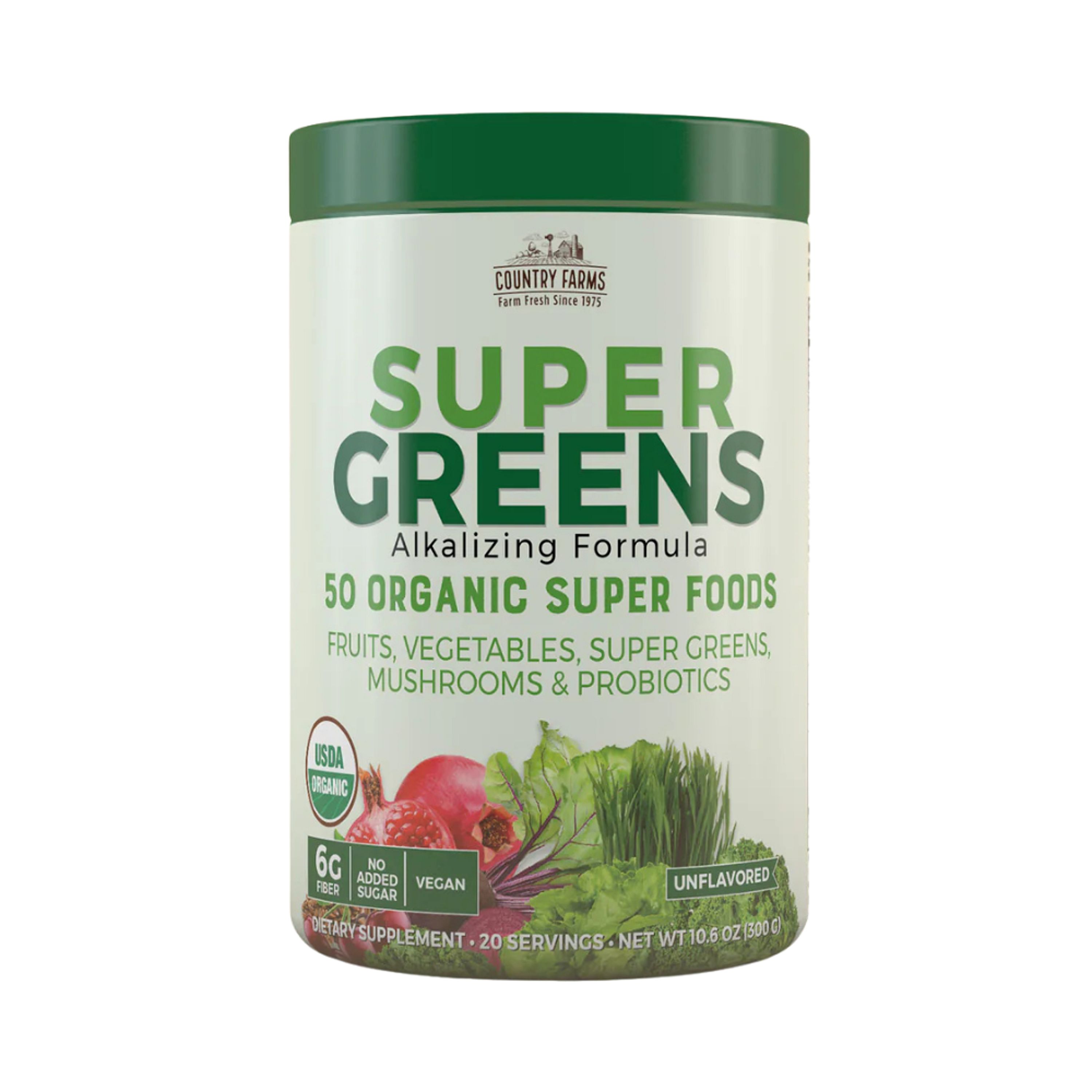 Super Greens is a refreshing powerhouse supplement that may support proper digestion, boost energy levels and immune health, while also helping to aid satiety. Country Farms are convenient, easy-to-use supplements that help restore daily consumption of essential fruits, vegetables, greens, sprouts, seeds and superfoods that Mother Nature intended us to enjoy.