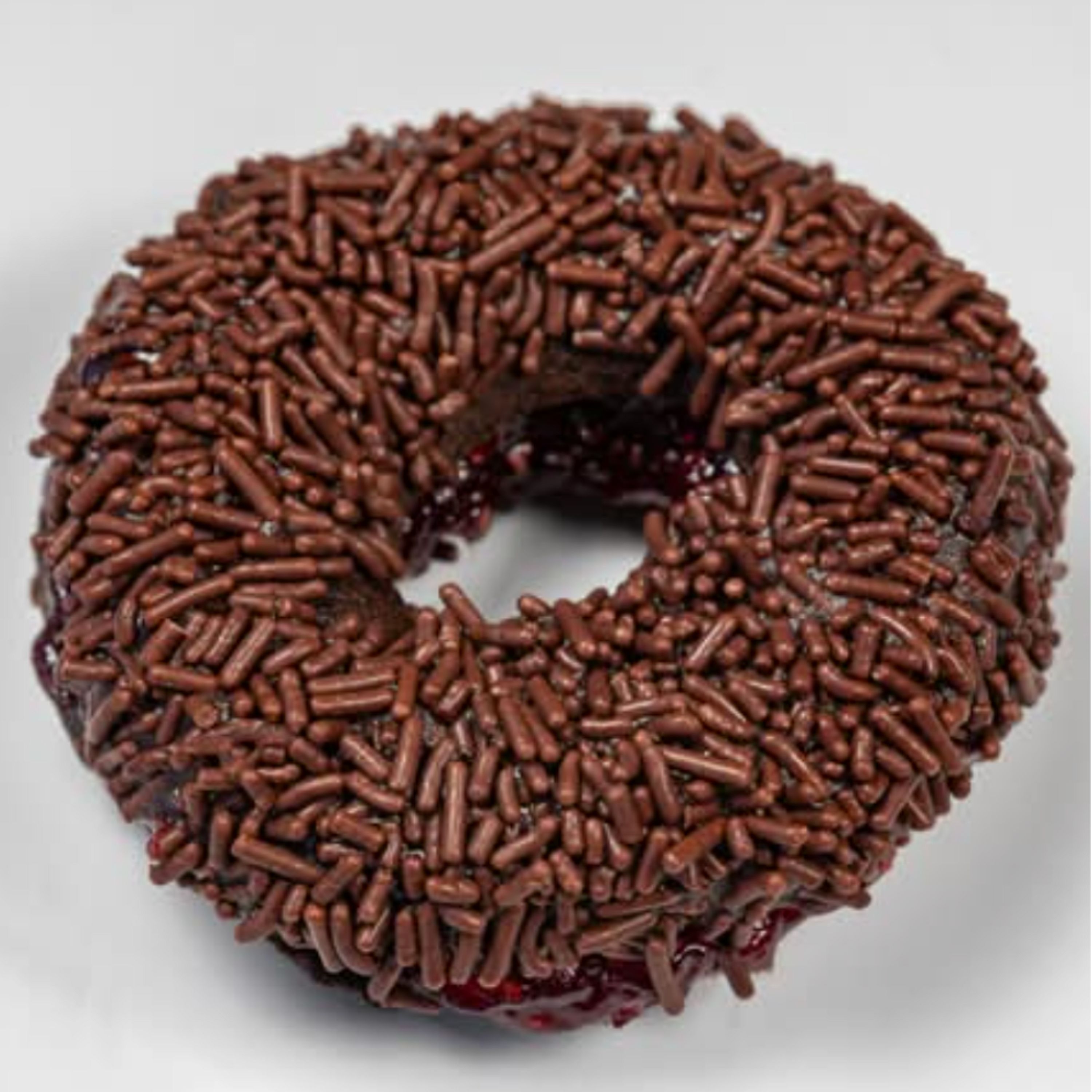 Chocolate donut, chocolate icing, chocolate sprinkles, raspberry.