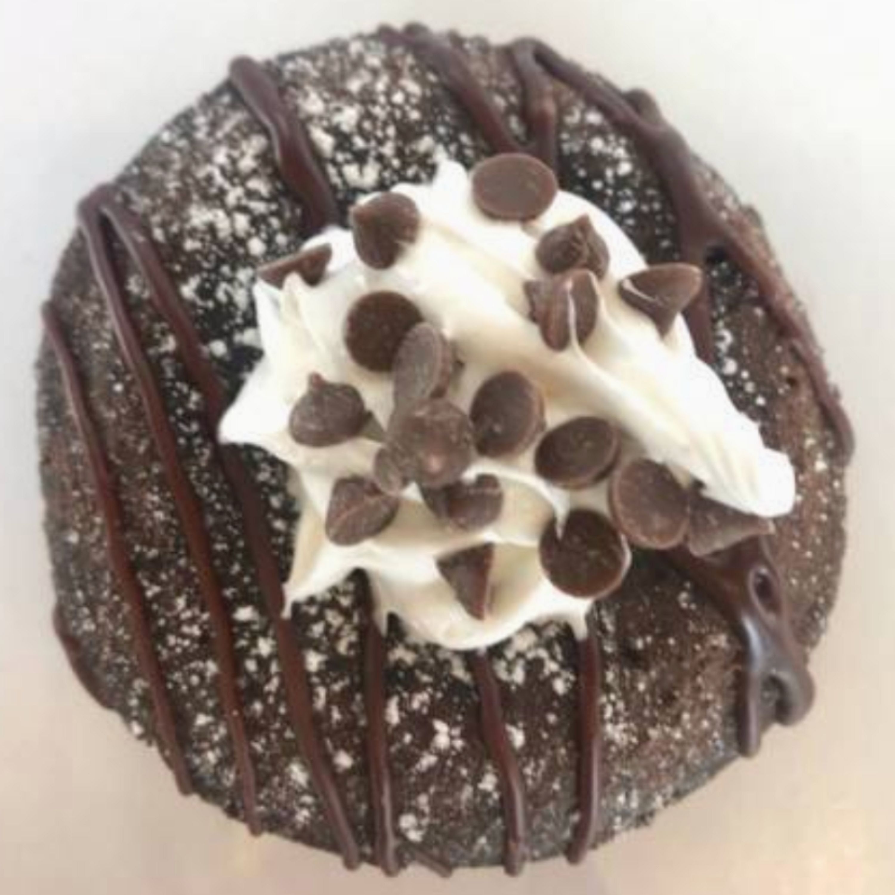Chocolate donut, powdered sugar, devil dog mousse, chocolate drizzle, chocolate chips.