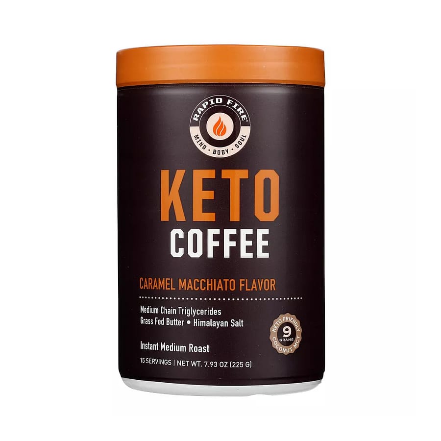 Rapid Fire Keto coffee Caramel Macchiato instant crafts the finest coffee beans with MCTs from pure coconut, grass-fed butter, and a touch of Himalayan salt to create a delicious, satisfying and nutritious coffee beverage. These powerful superfoods contain energizing caffeine, functional fats, fat-liberating essential fatty acids, and health-protecting antioxidants. This super creamy caramel macchiato flavored coffee beverage is delicious hot or iced. Rapid Fire Keto Coffee is a powdered, ketogenic, instant coffee mix made with grass-fed butter, coconut oil, MCT oil, and coffee. This fat-burning, keto-friendly coffee blend is ready in an instant and helps boost metabolism as well as satisfy your hunger.