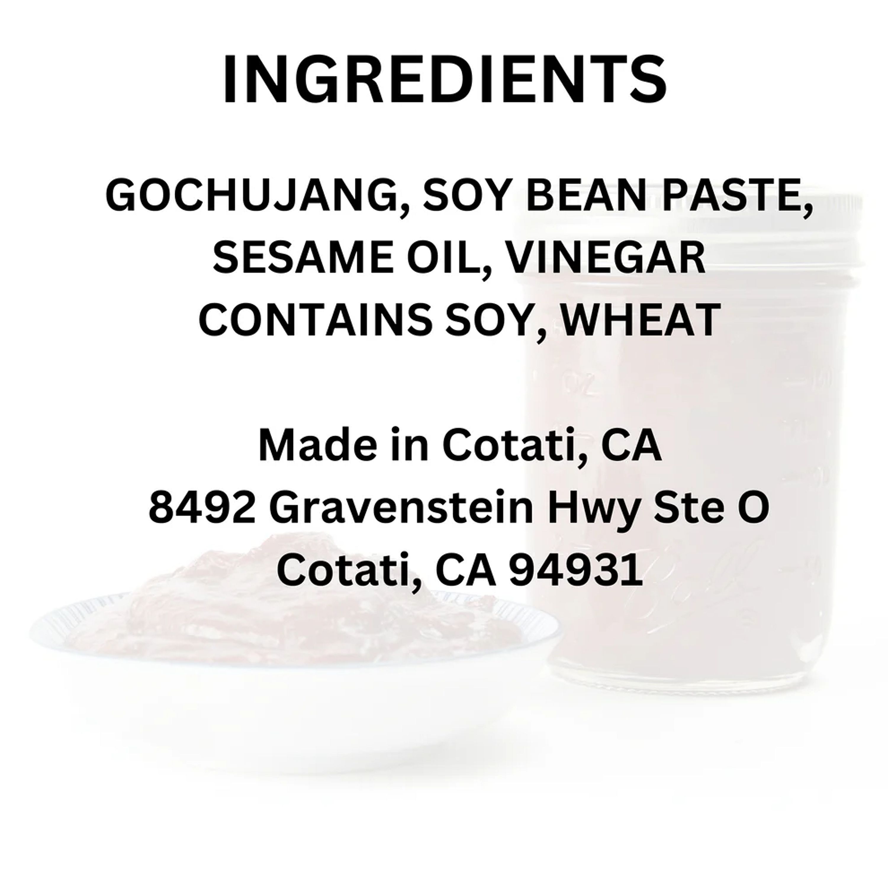 A condiment made of fermented soybean paste, gochujang, sesame oil & vinegar. It's sweet & spicy and commonly used as a dipping sauce for grilled meat and vegetables. Zero Sugar. Zero Msg. Ingredients: Gochujang, soy bean paste, sesame oil, vinegar